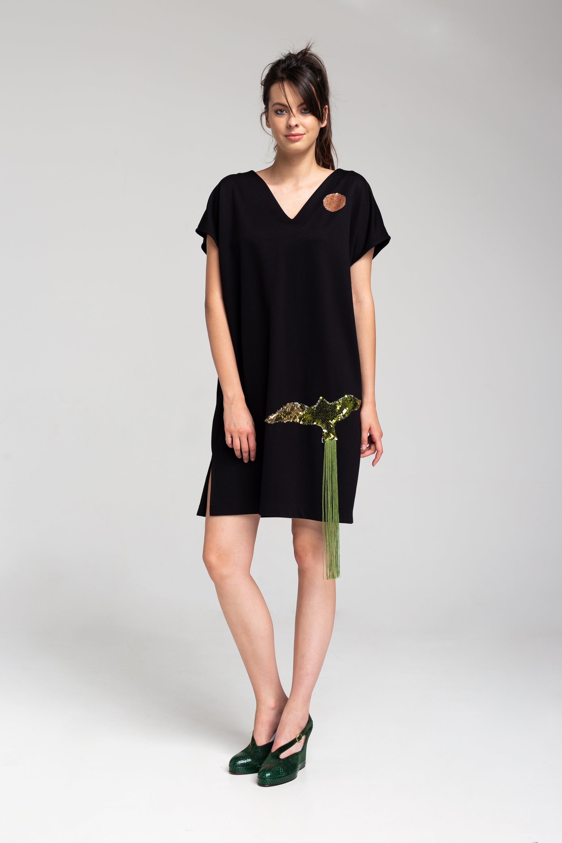 An easy-going V-neck mini dress with a sequined bird detail on the skirt. Slit on one side to elevate comfort.