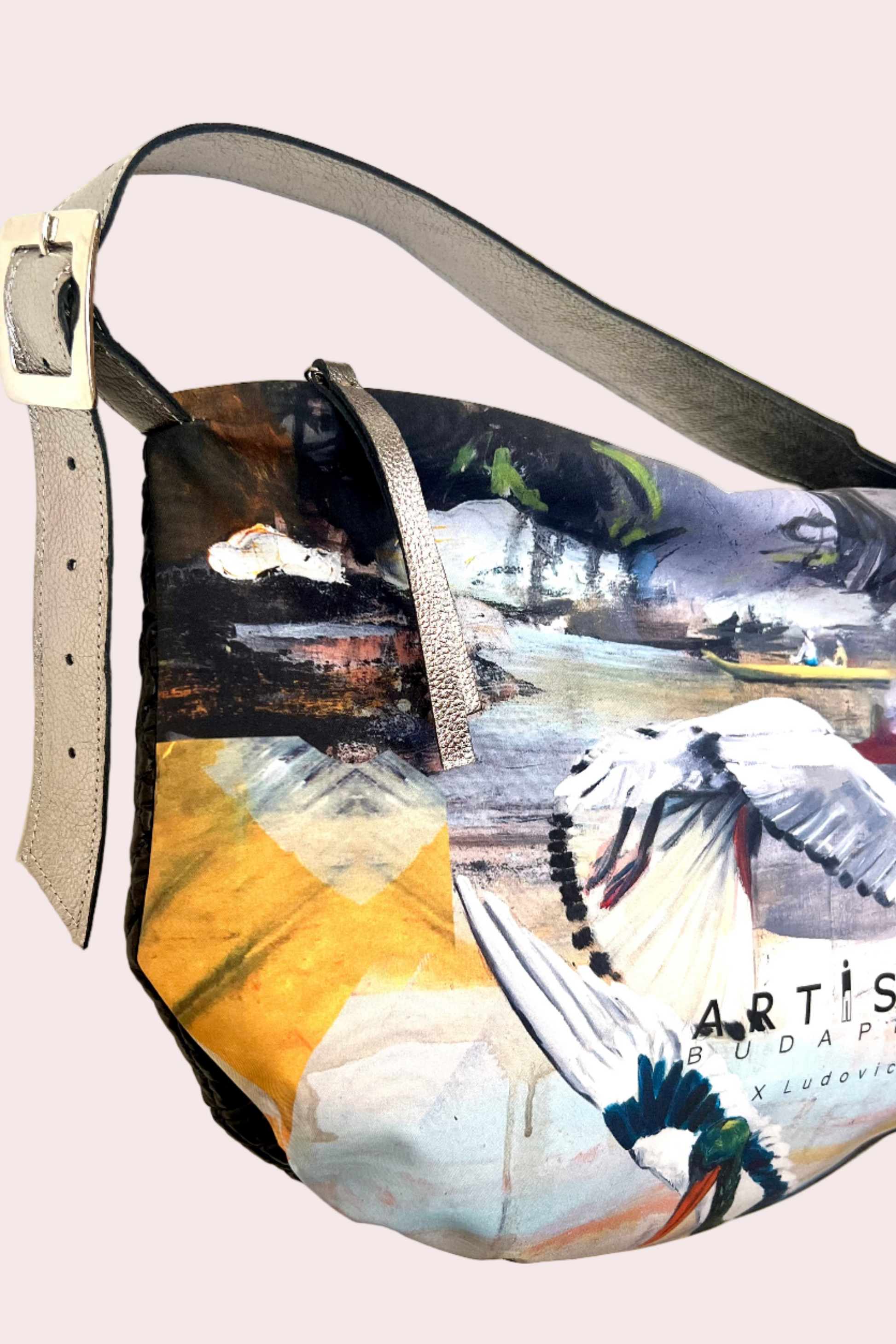 Printed textile bag with pocket inside. The adjustable strap is made of leather .