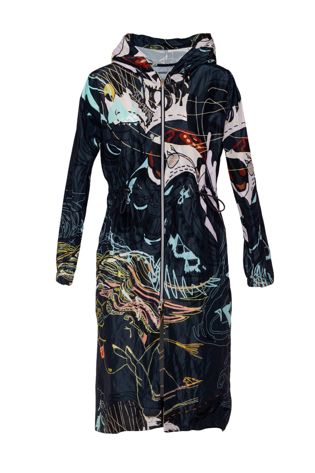 This eye-catching parka-style hooded jacket features a unique print. It's waterresistant, has a drawstring waist, inset pockets on both sides and a front zip fastening.