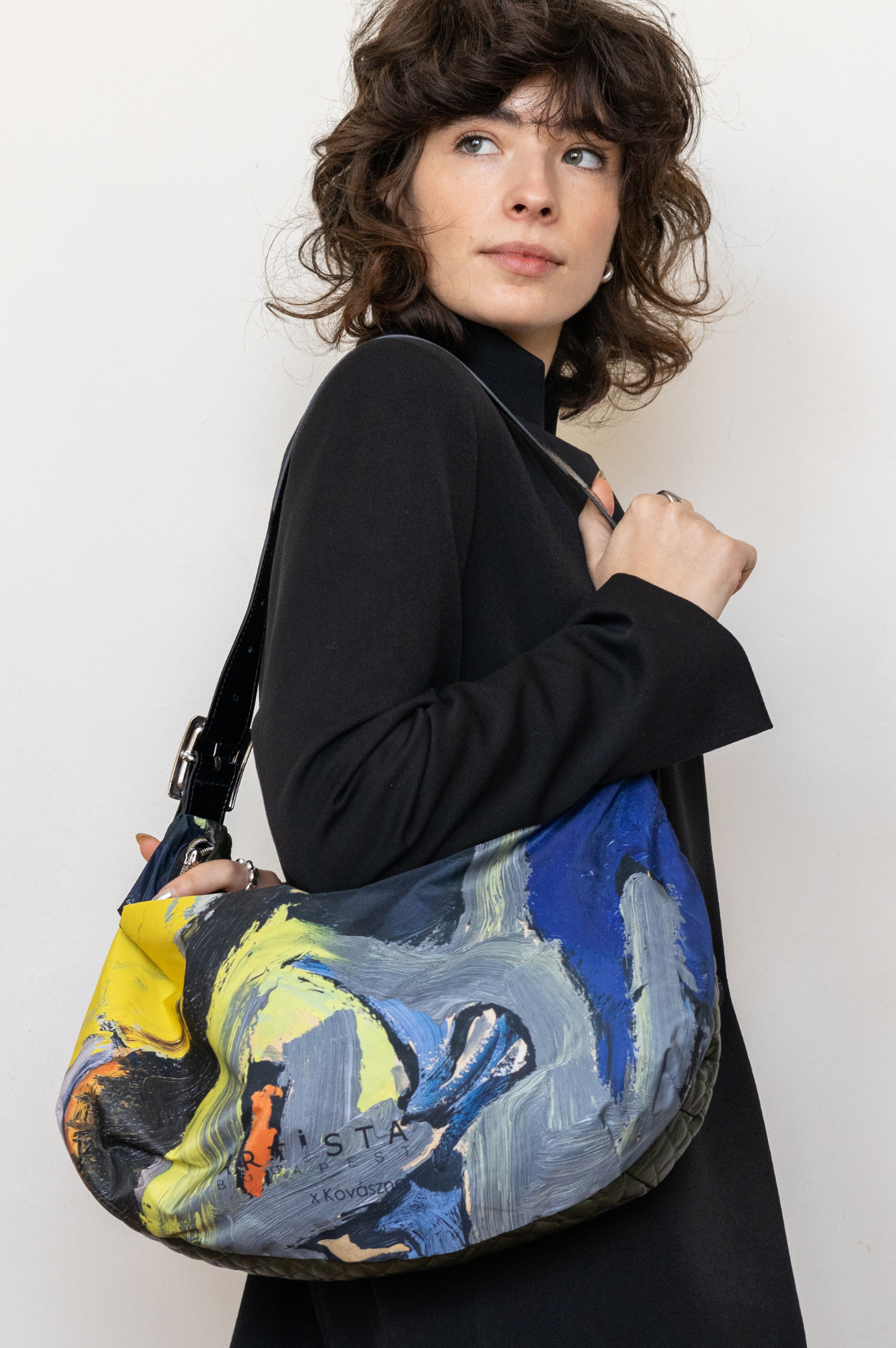 The little sister of BLUE BIRD bubble bag with pocket inside. The adjustable strap is made of leather. The print was designed by the unique painting of Gyorgy Kovasznai, the free-spirited, universal artist, from his film, Ca ira.