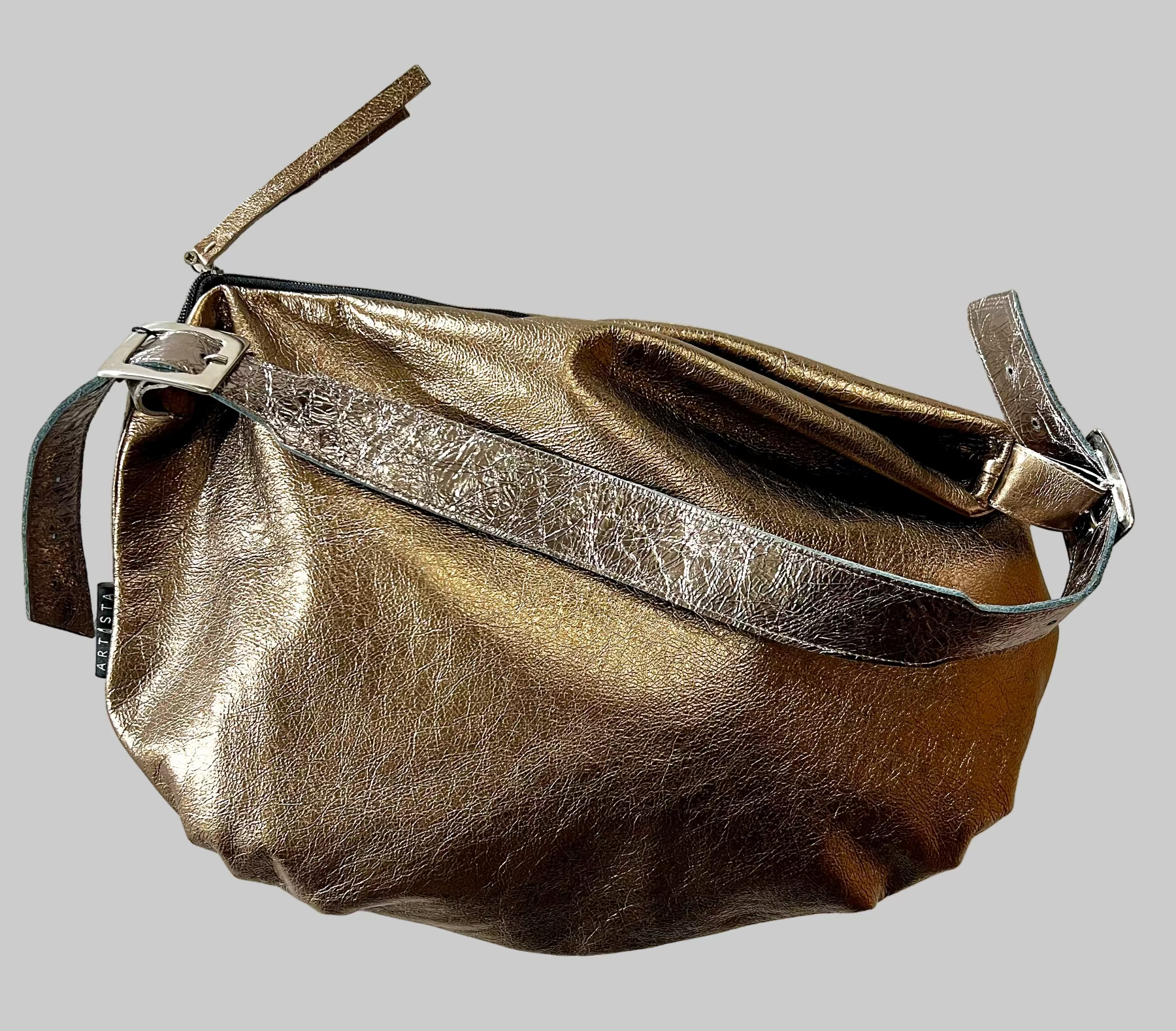 Shoulder or crossover bubble bag, made of shiny bronze leather, with adjustable leather straps on the shoulder.