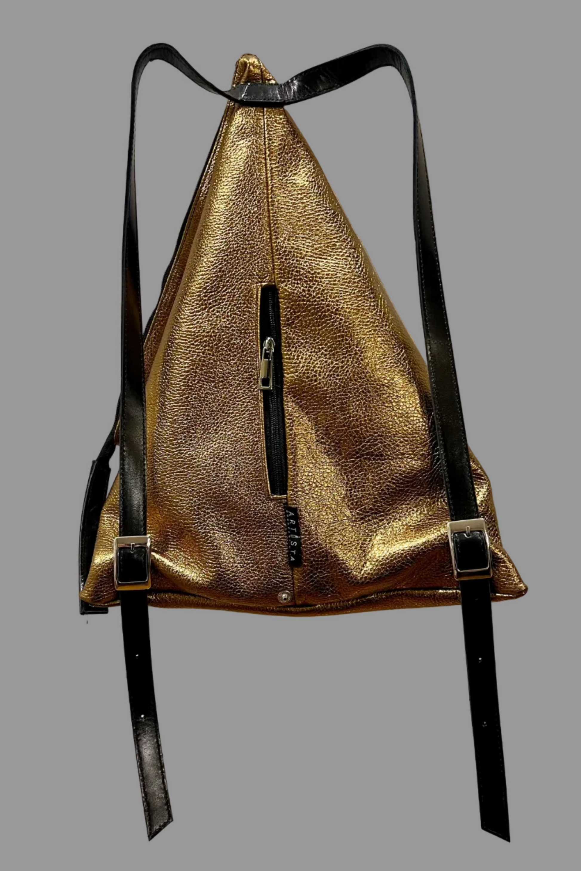 Origami backpack made from real, soft leather, with decorative leather straps and a small zipped pocket on the back.
