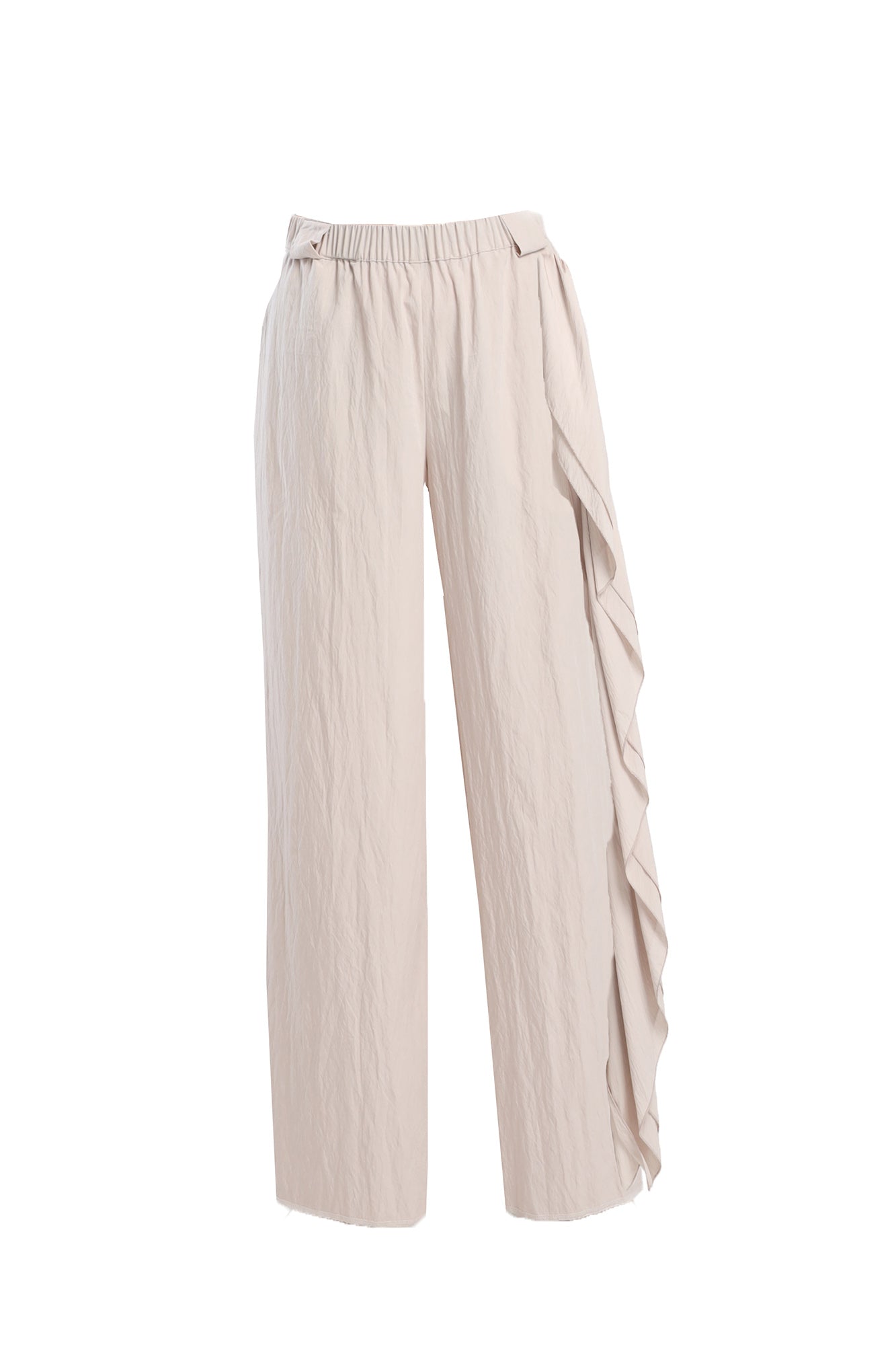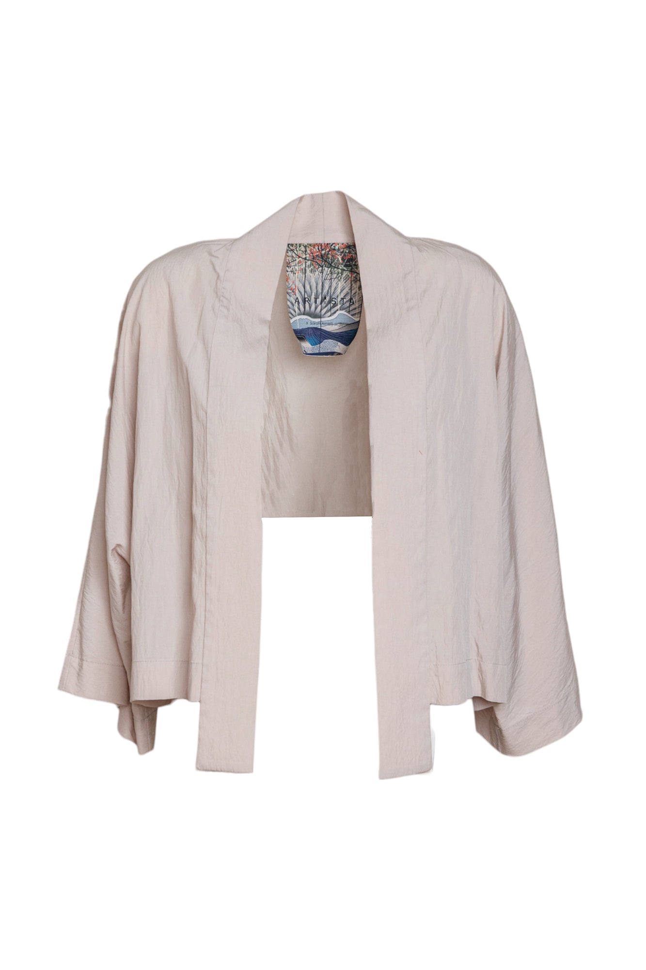 The CHARM Cropped Kimono with the CHARM Frill Pants are a tastful go-to outfit set. The beige colored kimono can be effortlessly worn as a jacket and the pants with detachable delicate frills on one side add a hint of elegance to the look.