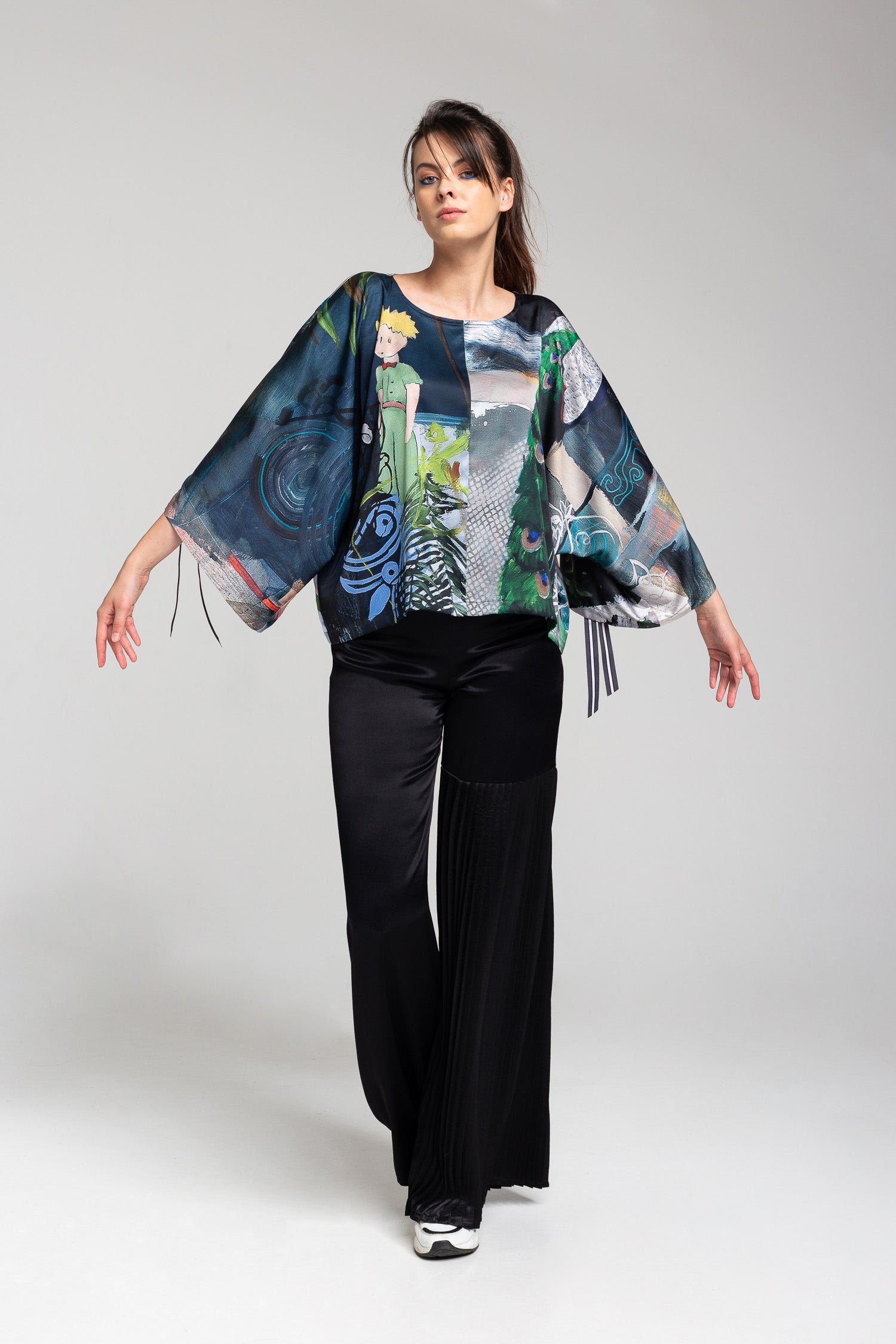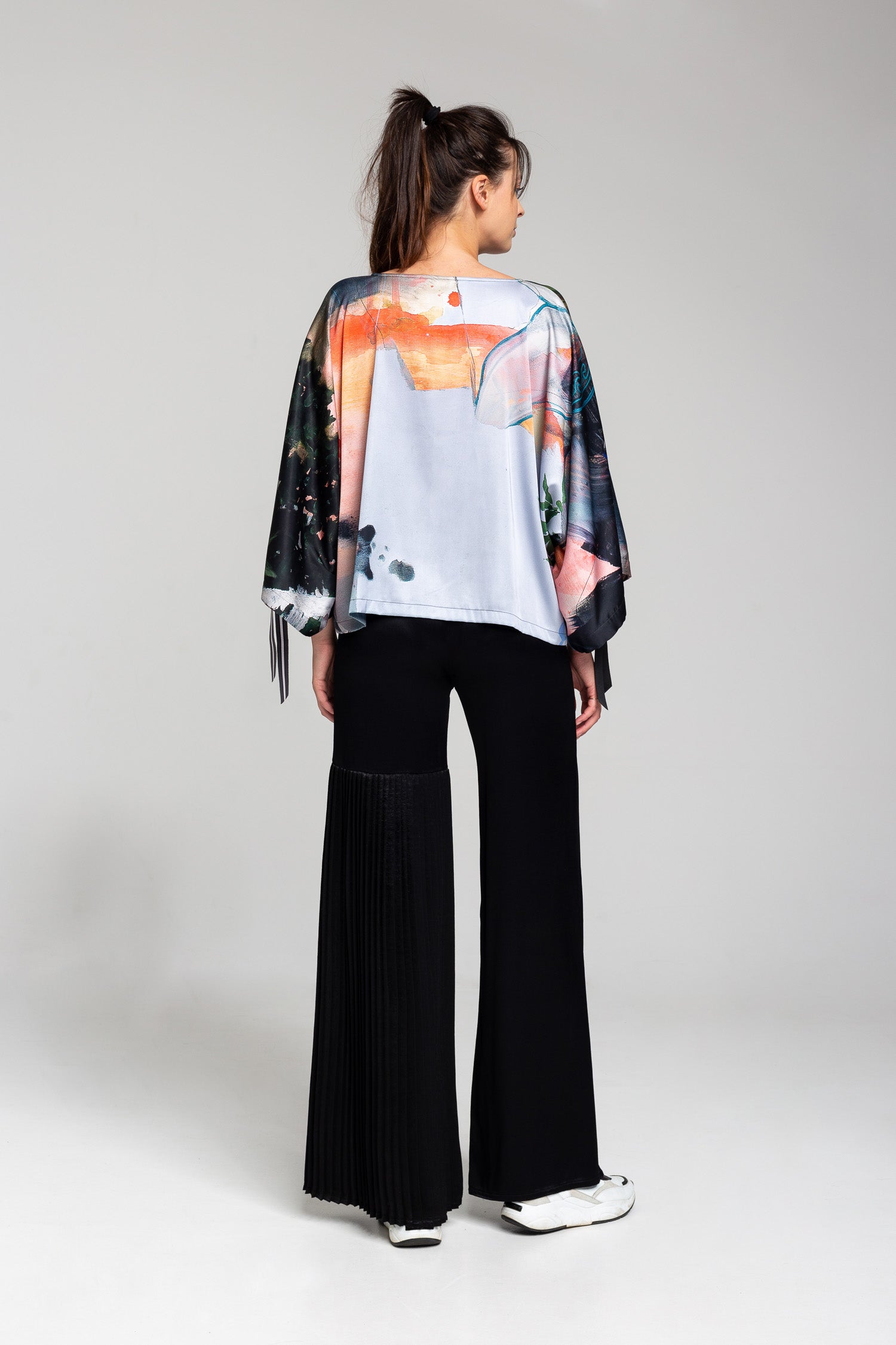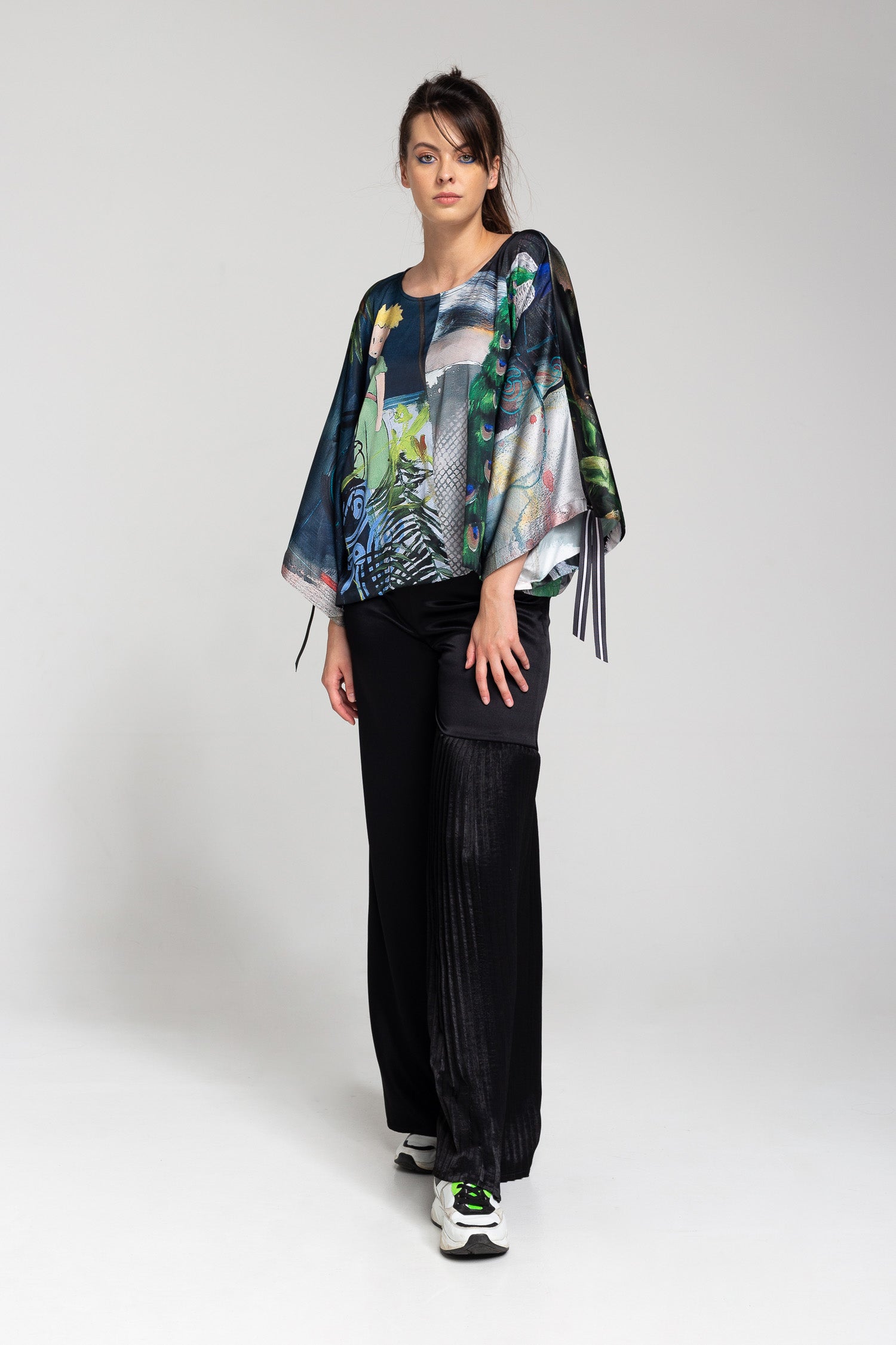 An easy-going casual blouse with artful print on soft, polyester satin. The elegant boat neckline, the 3/4 long batwing sleeves with drawstring at the cuffs make this piece a refined contemporary silhouette. Perfect for everday wear.