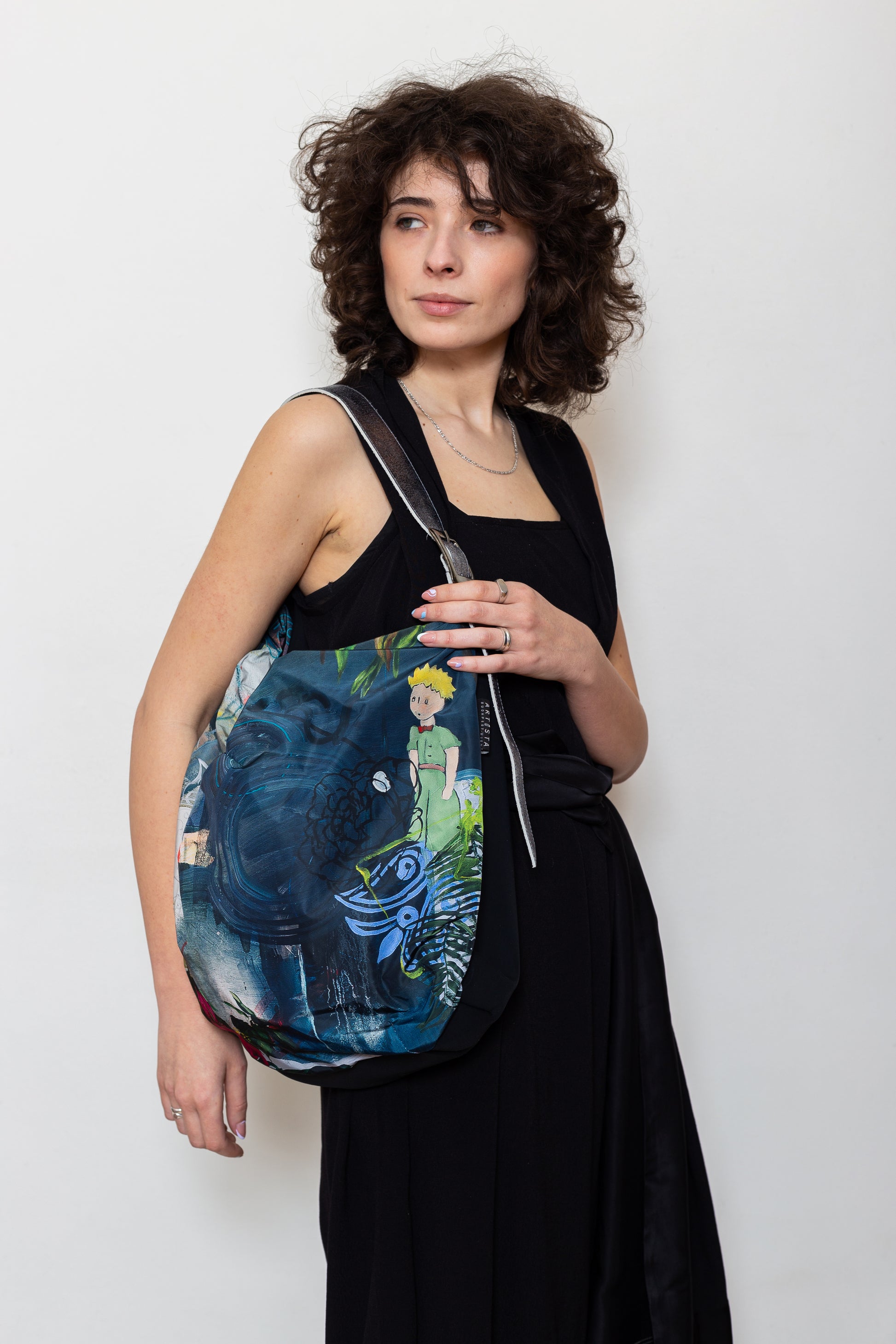 Printed textile bag with pocket inside. The adjustable strap is made of leather. Even a smaller laptop can fit in this bag or for your necesary goods of a weekend travel.