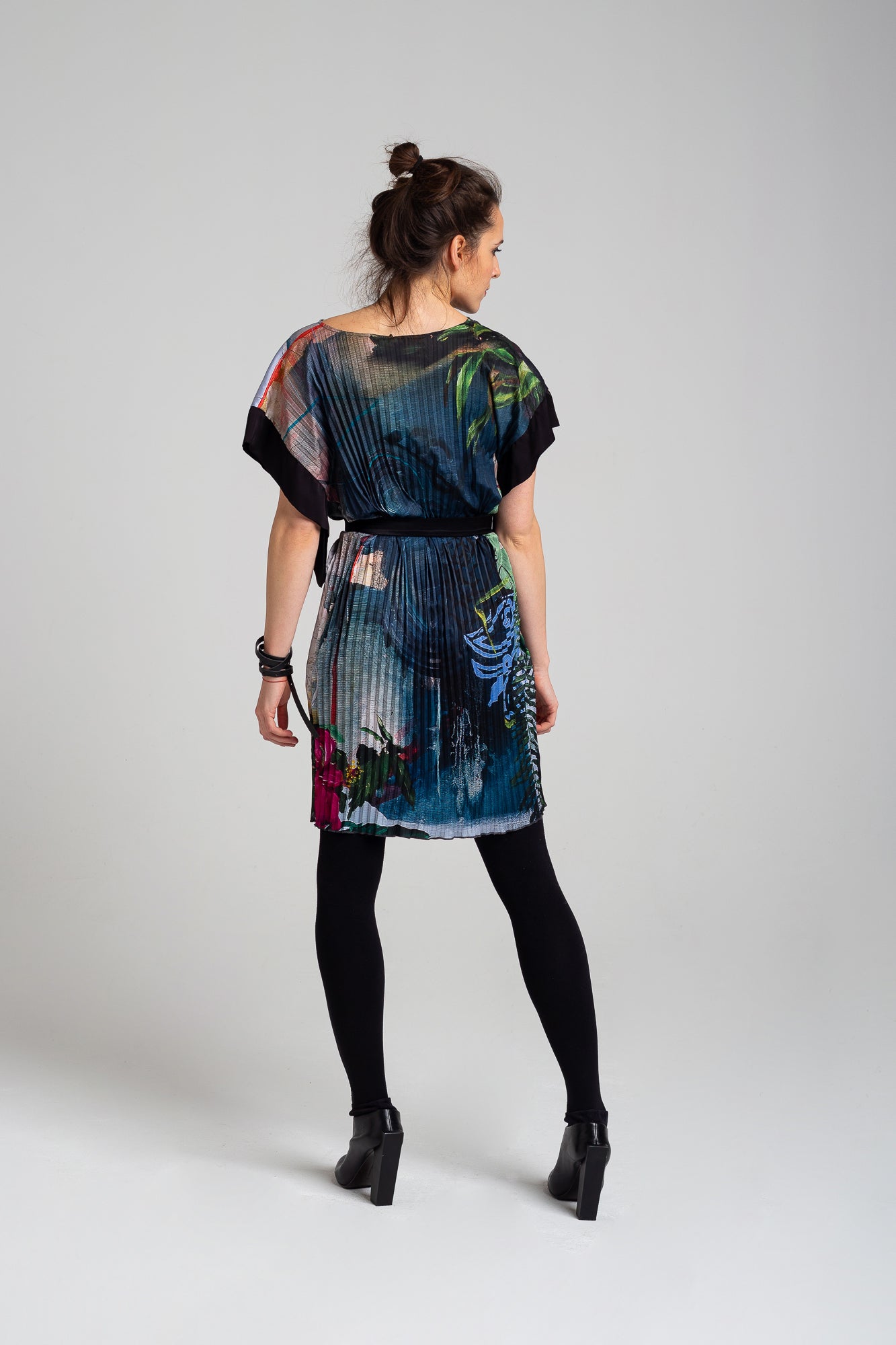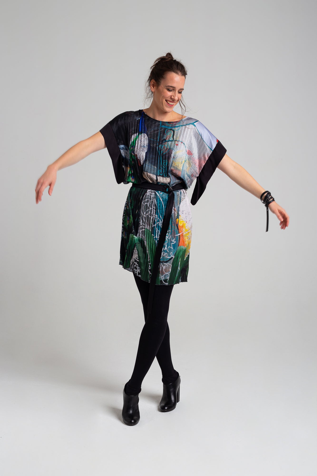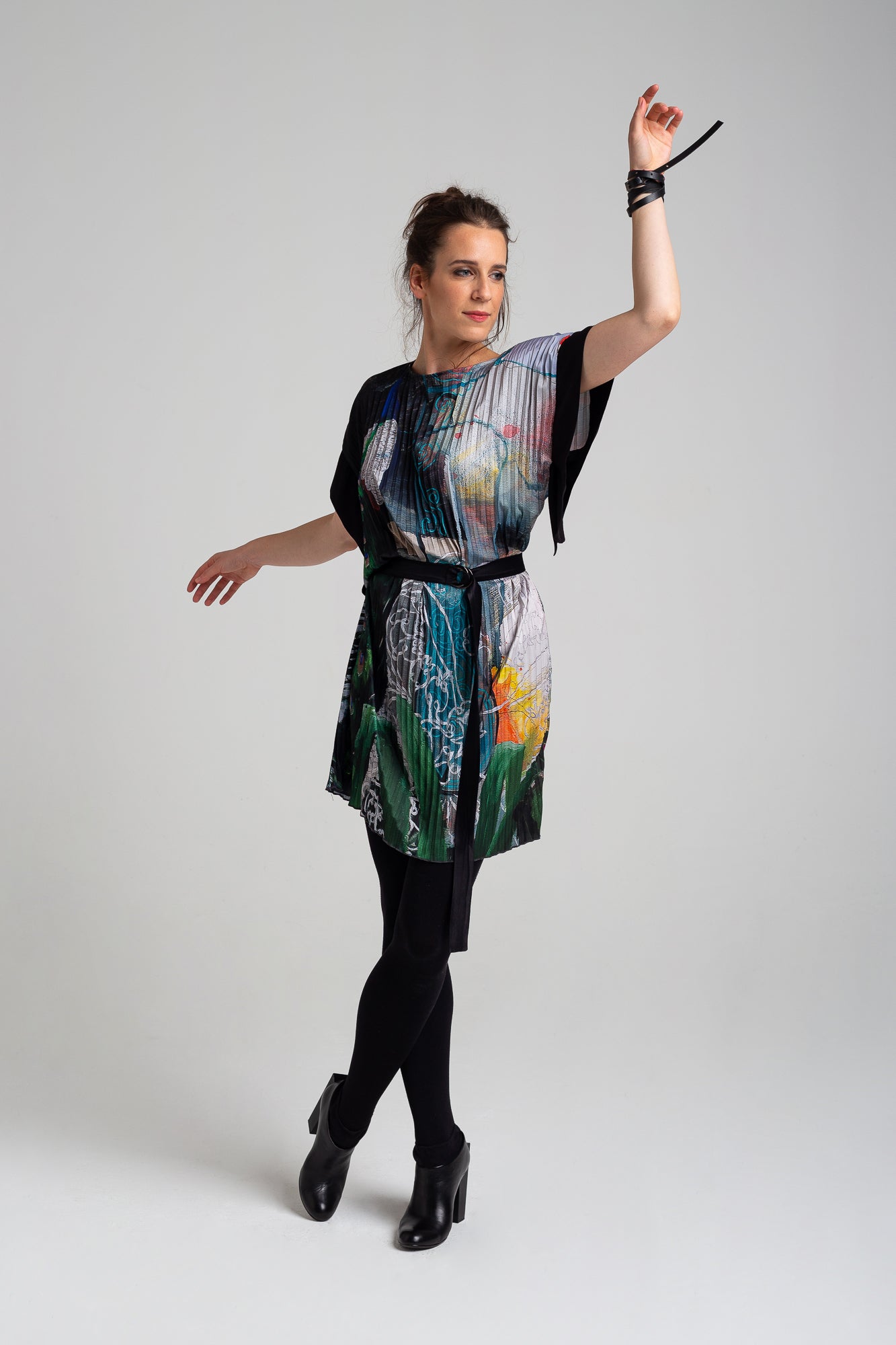 Short pleated dress, made with the unique prints of the French painter, Ludovic Thiriez' painting.