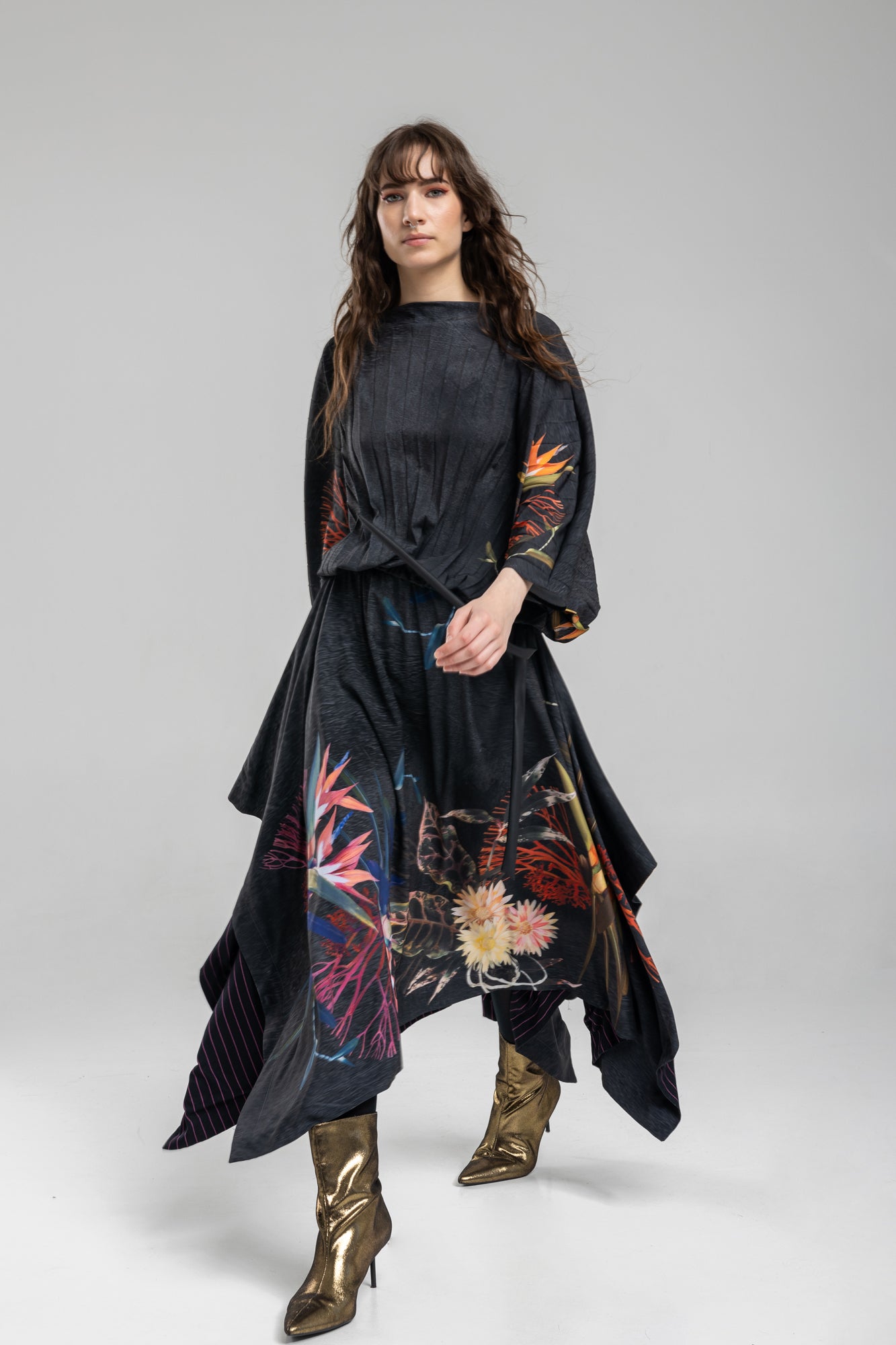 György Korga's, Hungarian Surrealist Painter series made in the seventies was based on Ikebanas. The prints of this season's collection based on them. In addition to the aesthetics of the paintings, the spirit of ikebana provided a lot of inspiration during the design, as it symbolizes five things such as negative space , asymmetry, balance, avoidance of intentionality and the concept of just enough.