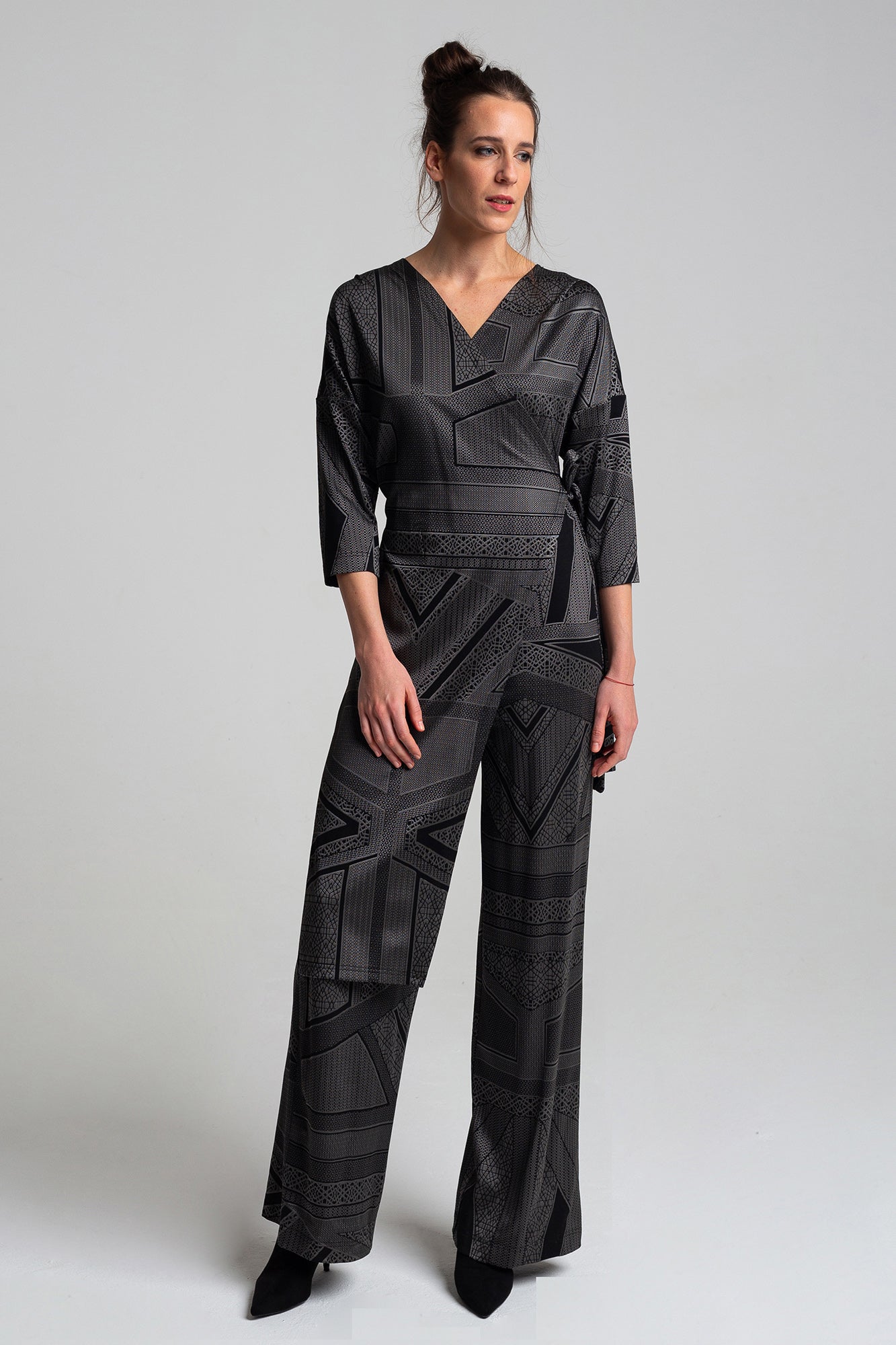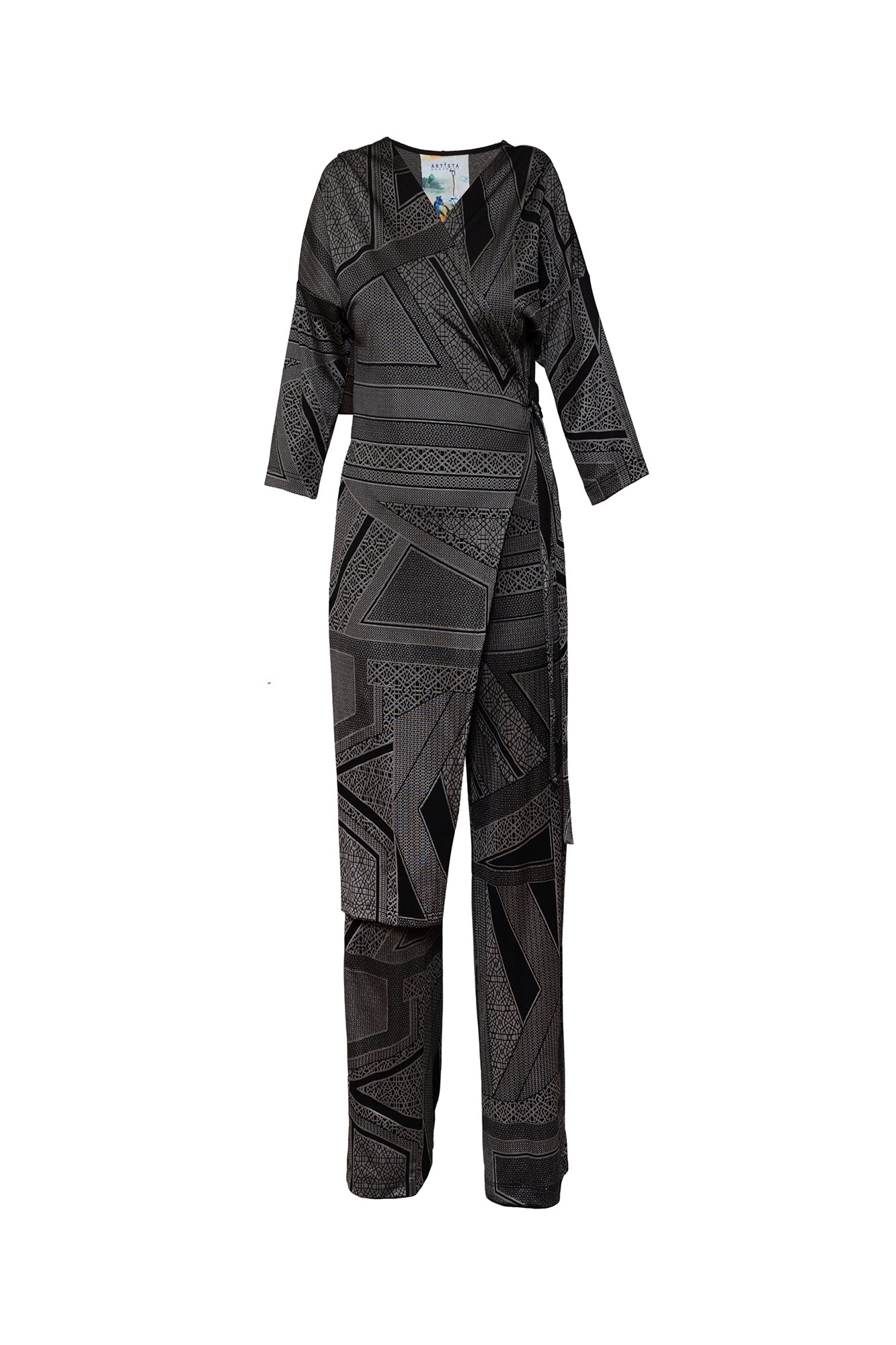 A feminine jaquard jumpsuit with an overlapped silhouette. Its own tie belt at the waist ensures a perfect fit. This style is full length and has a long sleeve that offers feminine coverage for the arms.