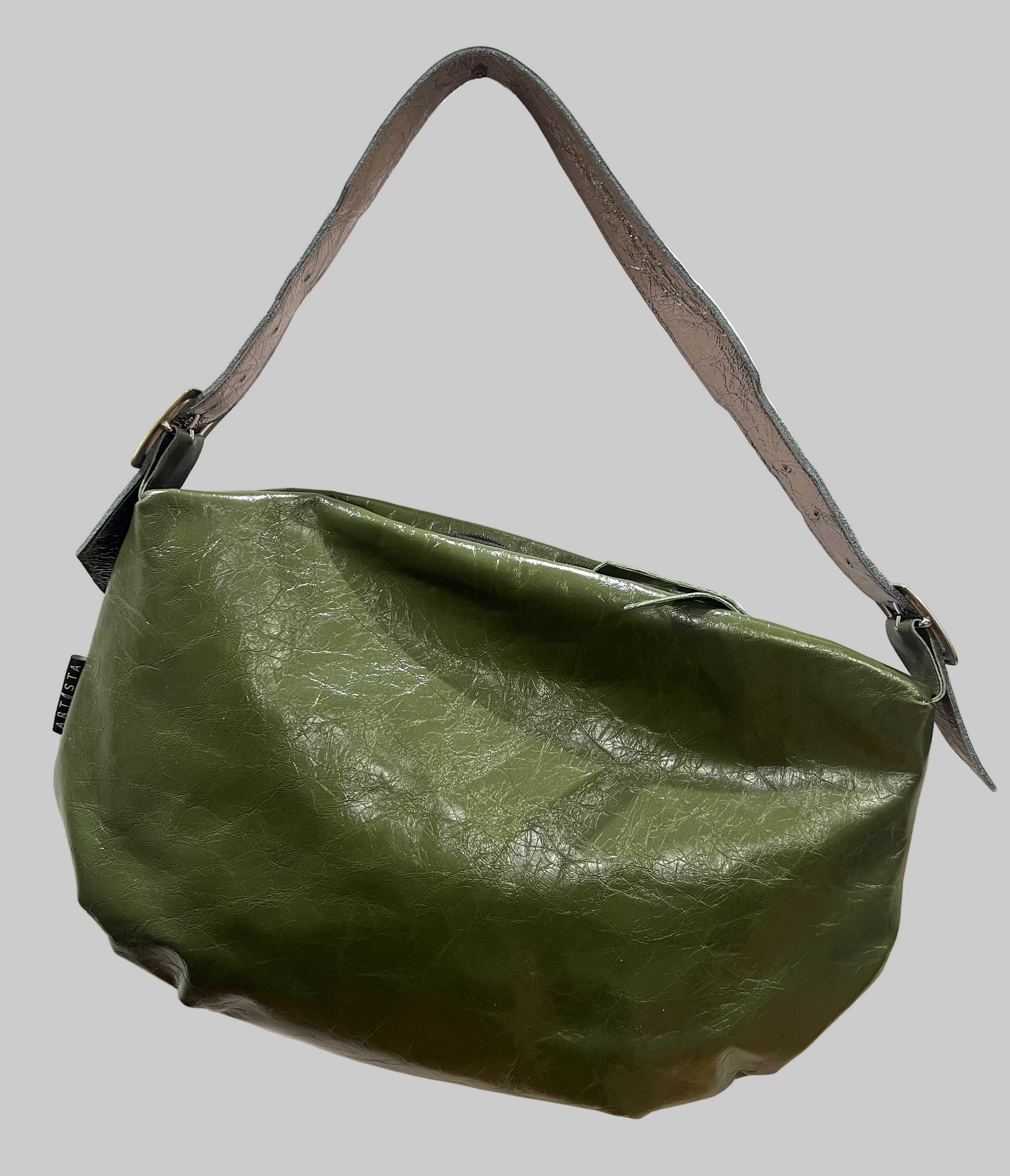 Shoulder or crossover bubble bag, made of shiny bronze leather, with adjustable leather straps on the shoulder.