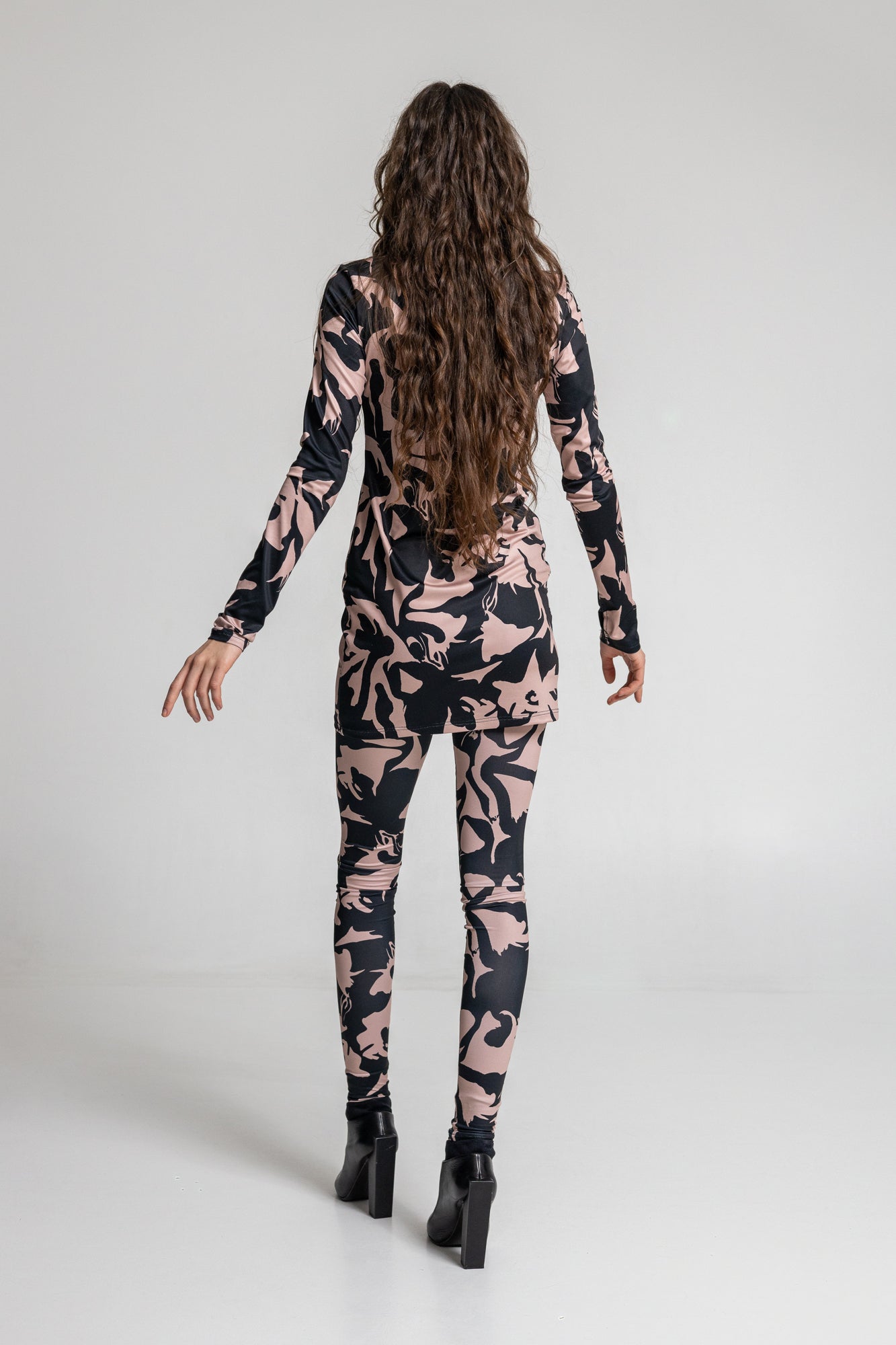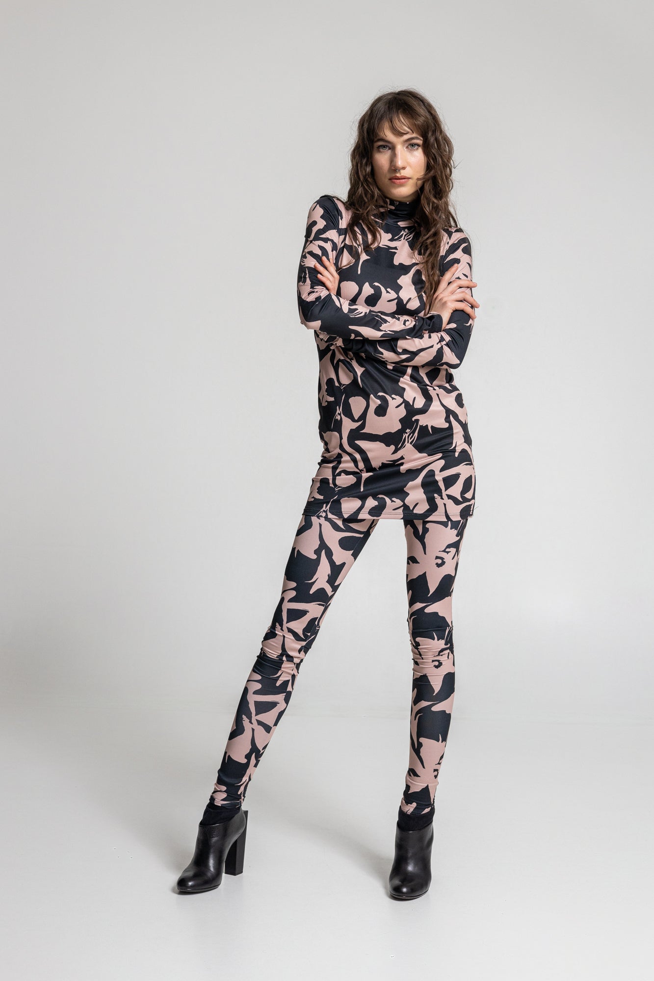 The Jasper Printed Leggings are a comfortable choice for everydays. With its mid-rise finish and elastic fabric these leggings are perfect for a layered look. Pair it with the Shadows Elastic Turtleneck Mini Dress for a contemporary urbanist outfit.
