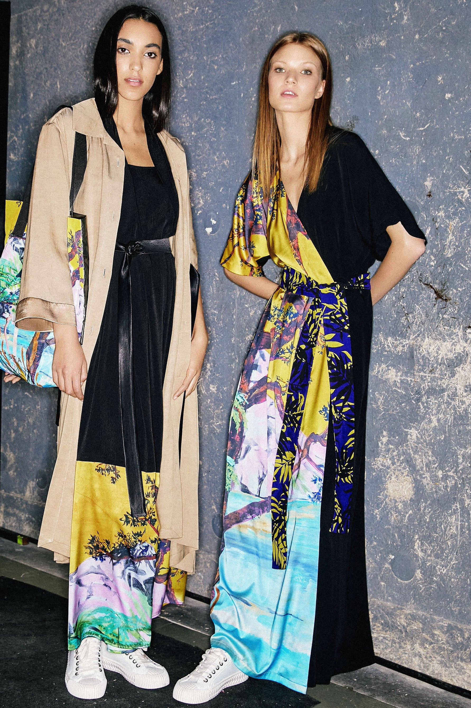 Made of printed polyester and black viscose georgette.