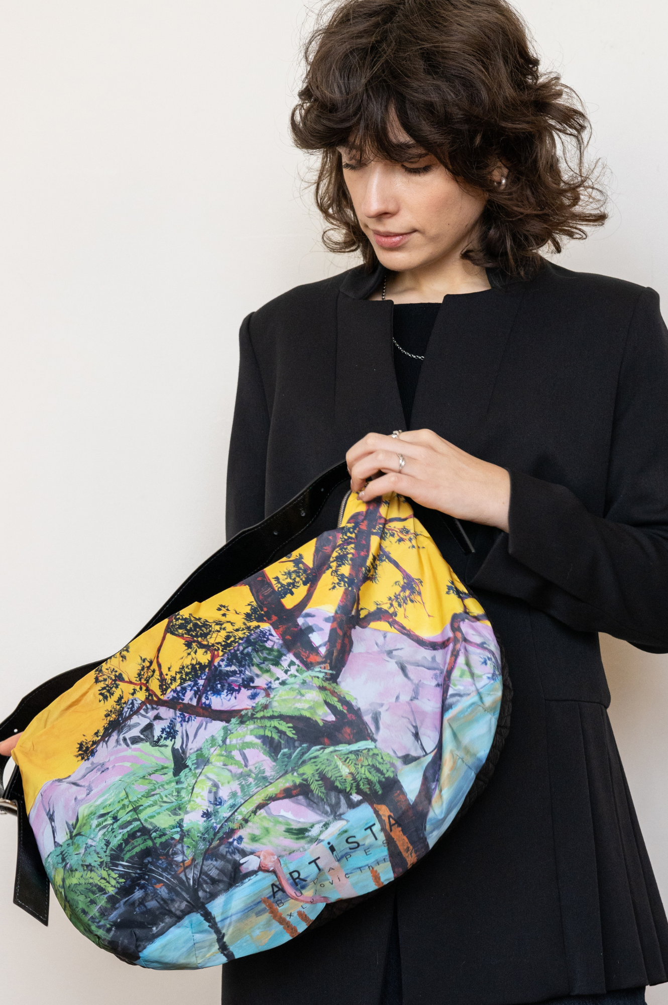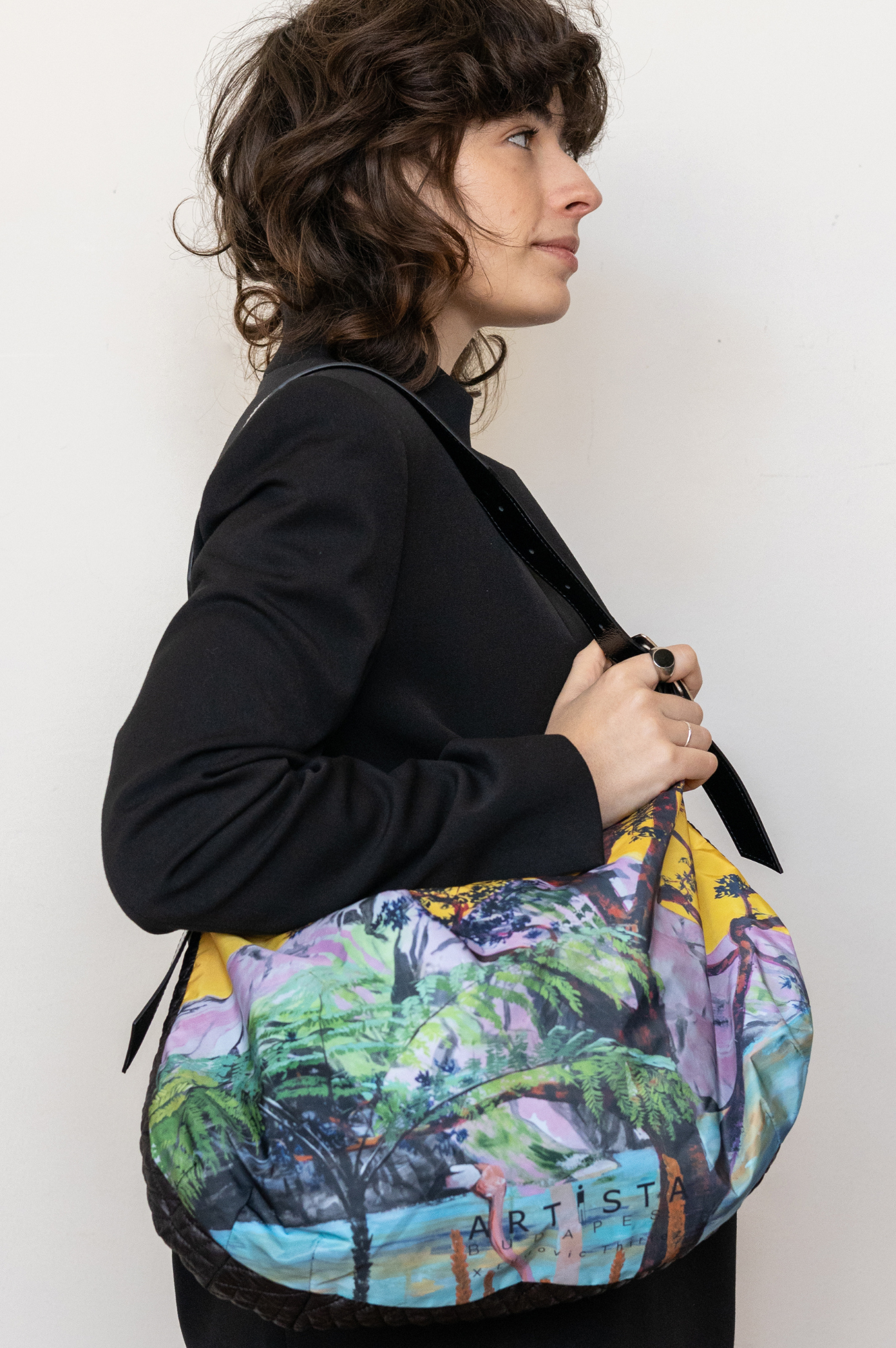 Printed little textile bag with pocket inside. The adjustable strap is made of leather. The print was made with a unique painting of Ludovic Thiriez.