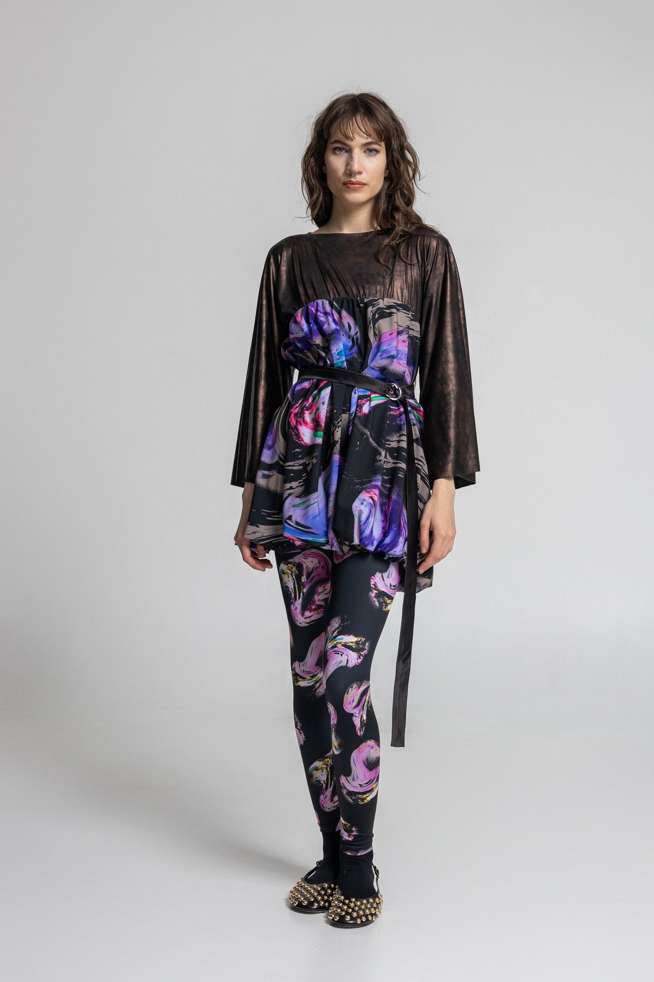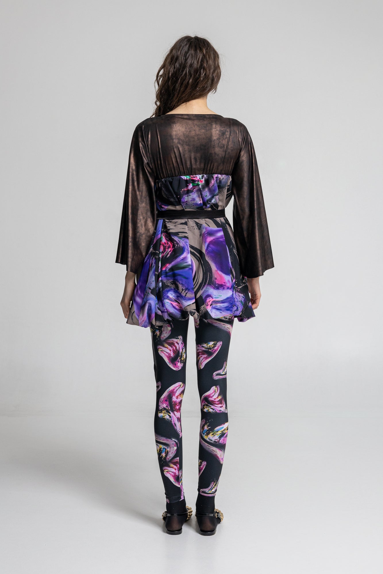 The Moire Printed Mini Dress fuses a swirling crsytal-like print with luxurious synthetic silk fabric for a refined look. Metallic bronze elastic jersey sleeves on the chest and back add subtle contrast white the bubbly hemline and 3/4 length flared bell sleeves enhance its elegant silhouette. Designed as a slip-on, this mini dress combines effortless elegance and comfort, perfectly paired with the Rose Crystal Printed Leggings for a sophisticated ensemble.