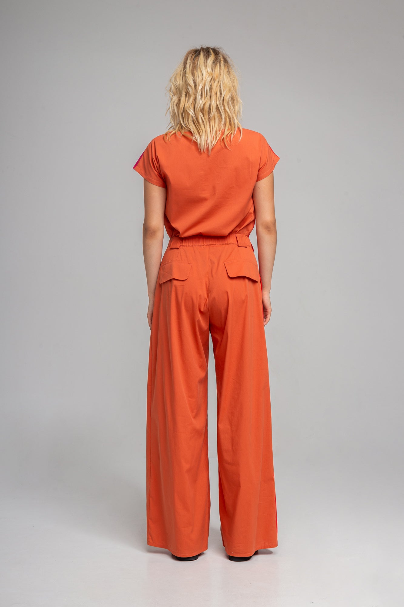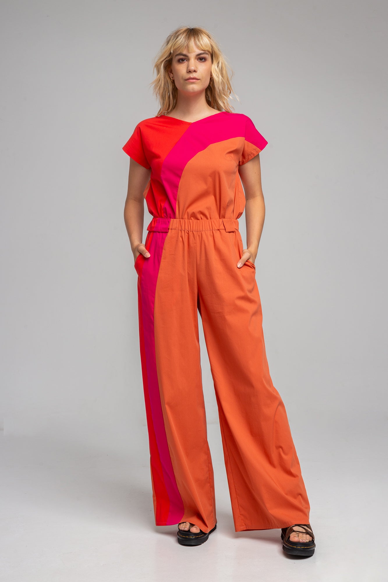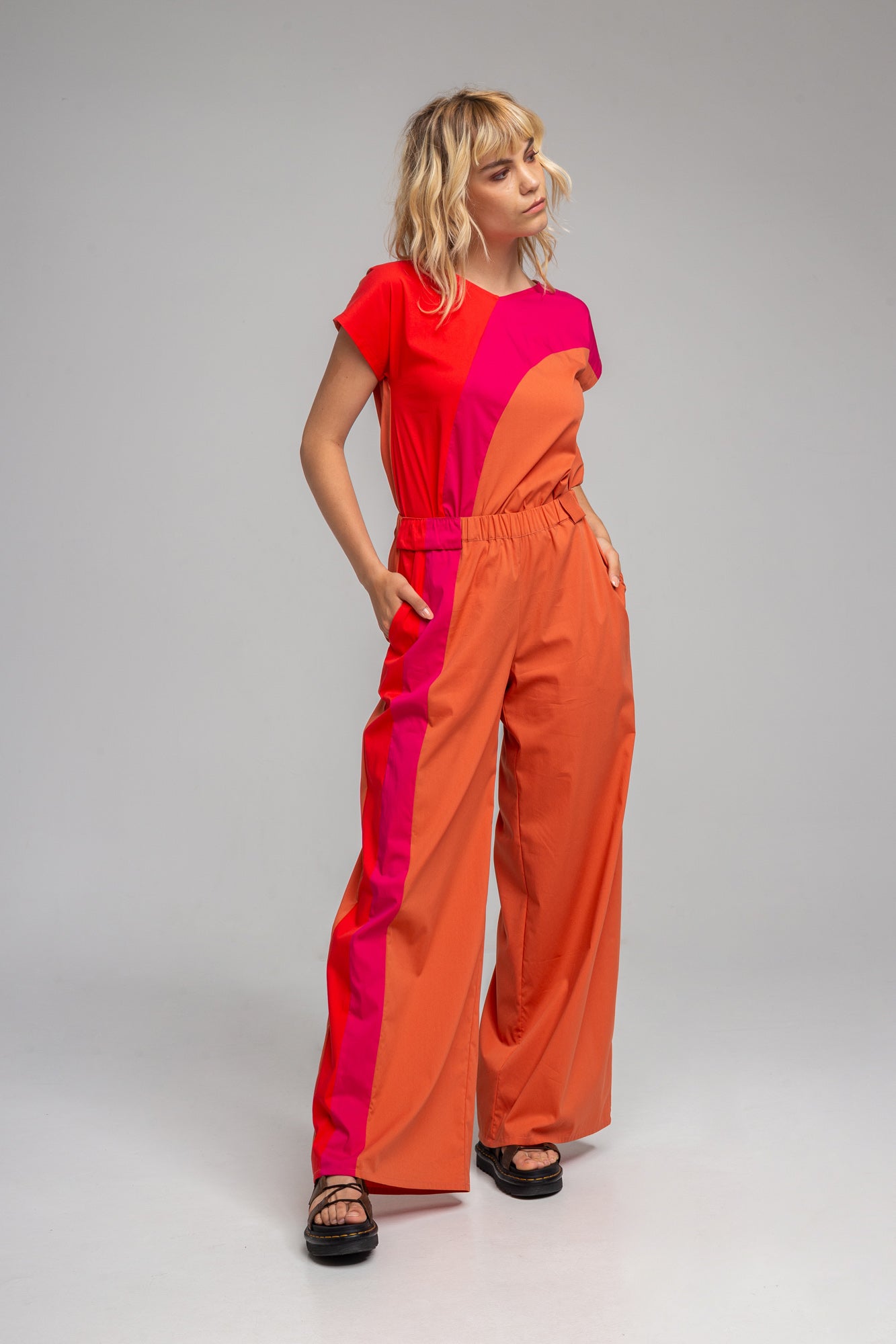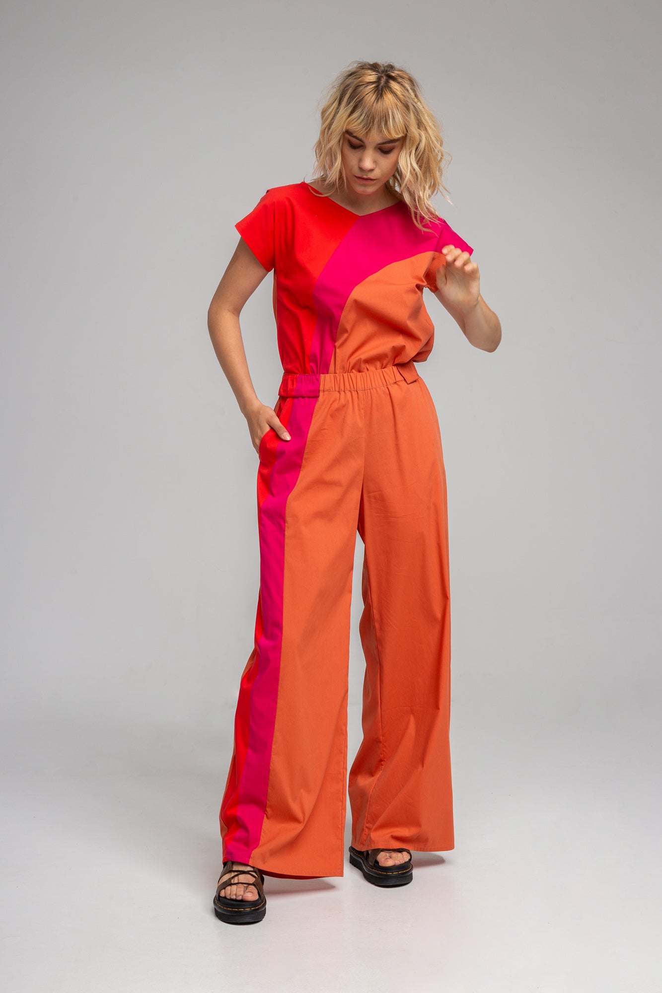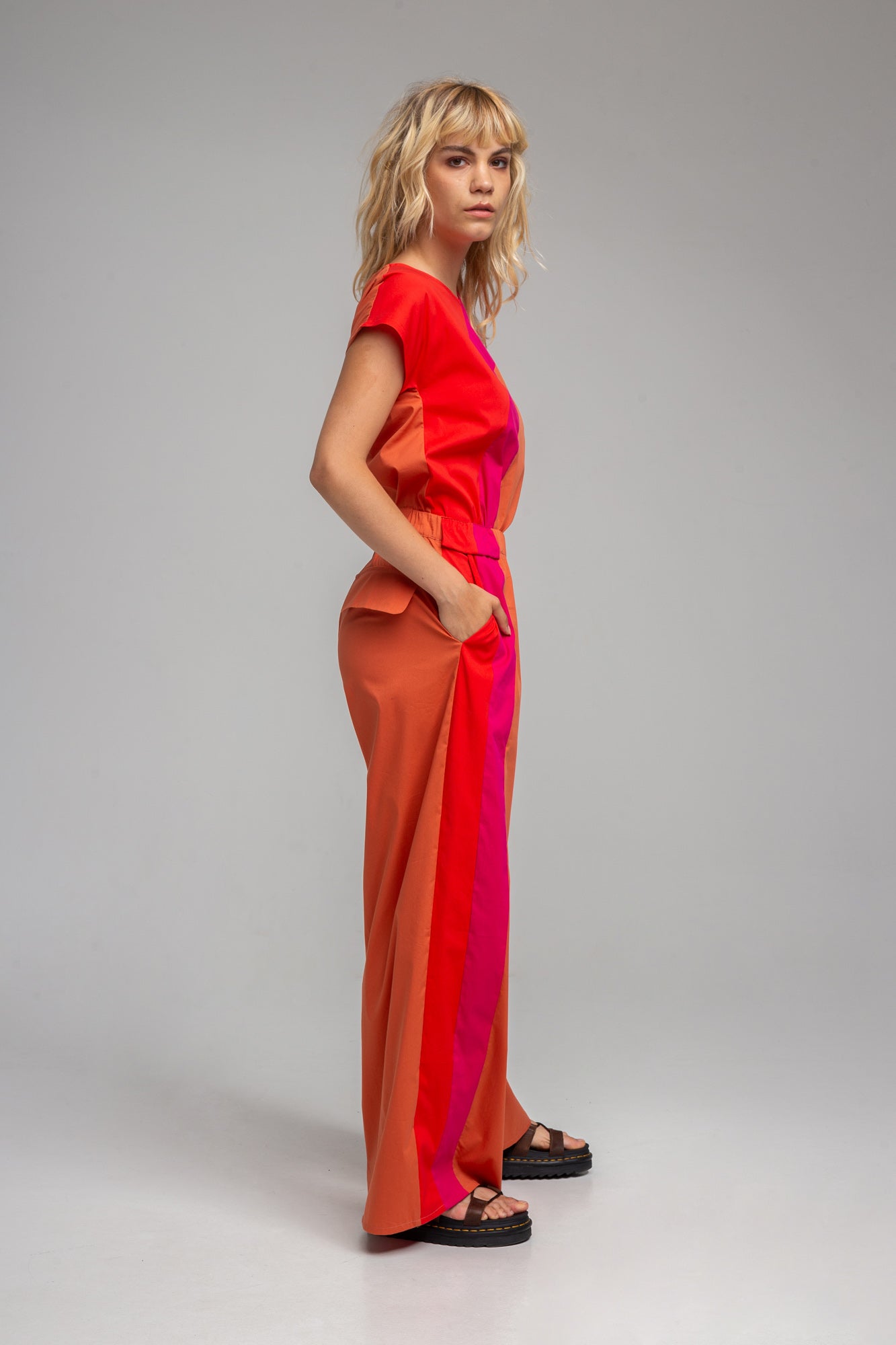 The vibrant red, pink, and orange colors are sure to make a statement. The MONA colourblock red pants are crafted in stretch cotton blend fabric. These wide leg palazzo pants feature interior pockets and an elasticated waistband with decorative belt loops. These boldly coloured pants are both practical and stylish.