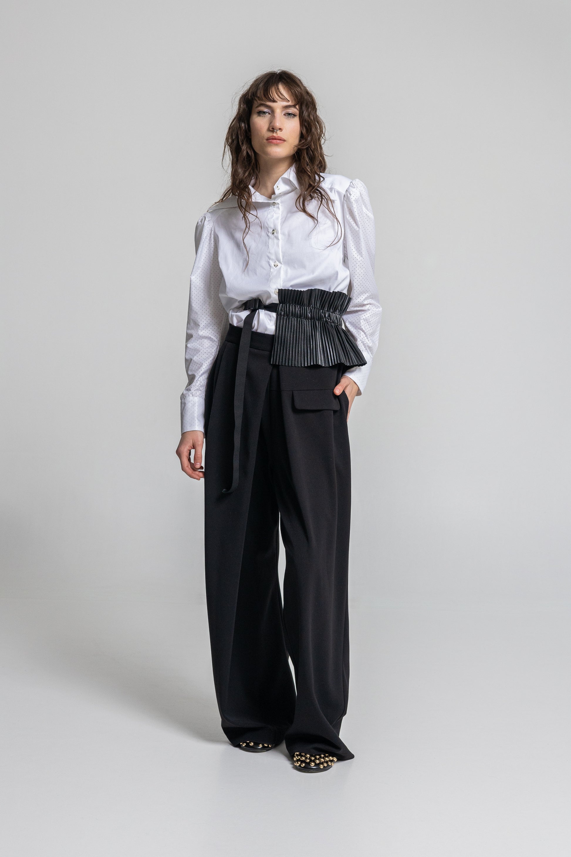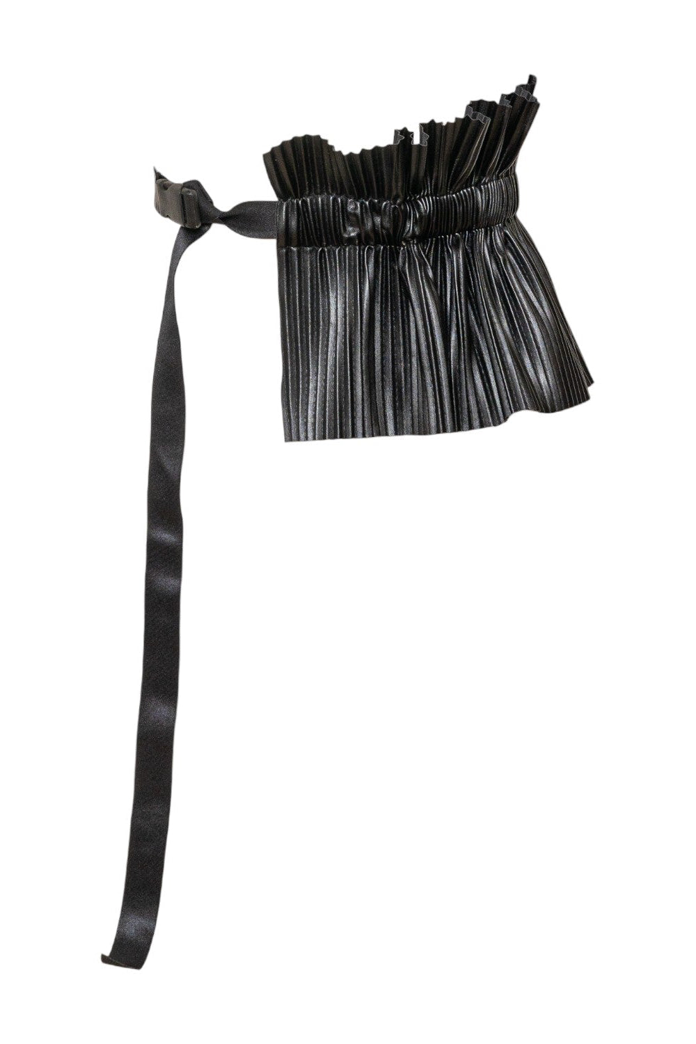 This accessory will make your outfit more casual. It can be worn over a dress or a jacket as well. Made of finely pleated leatherette.