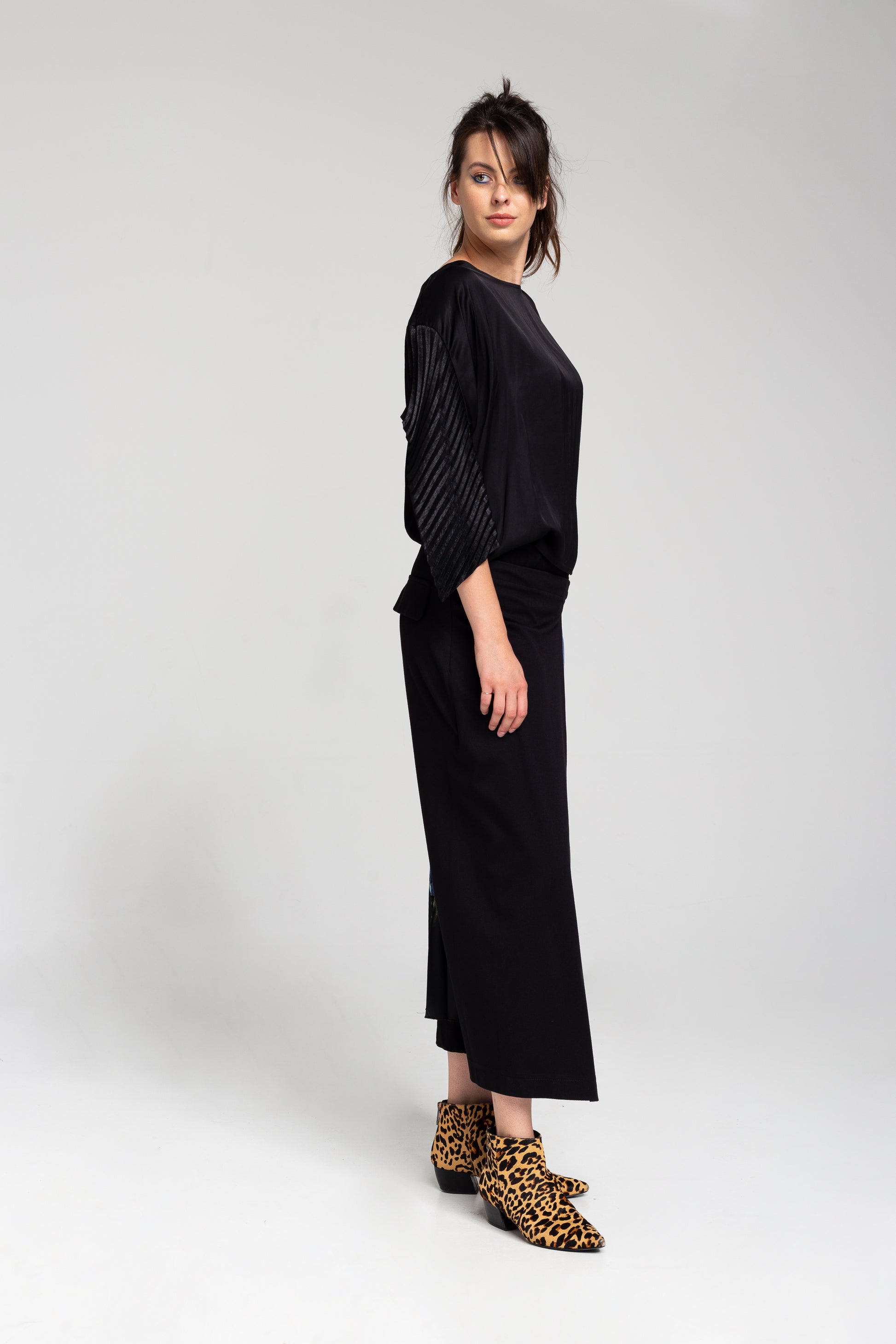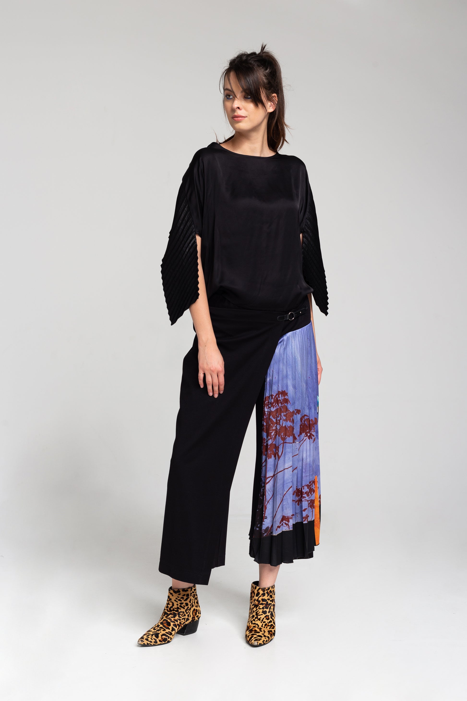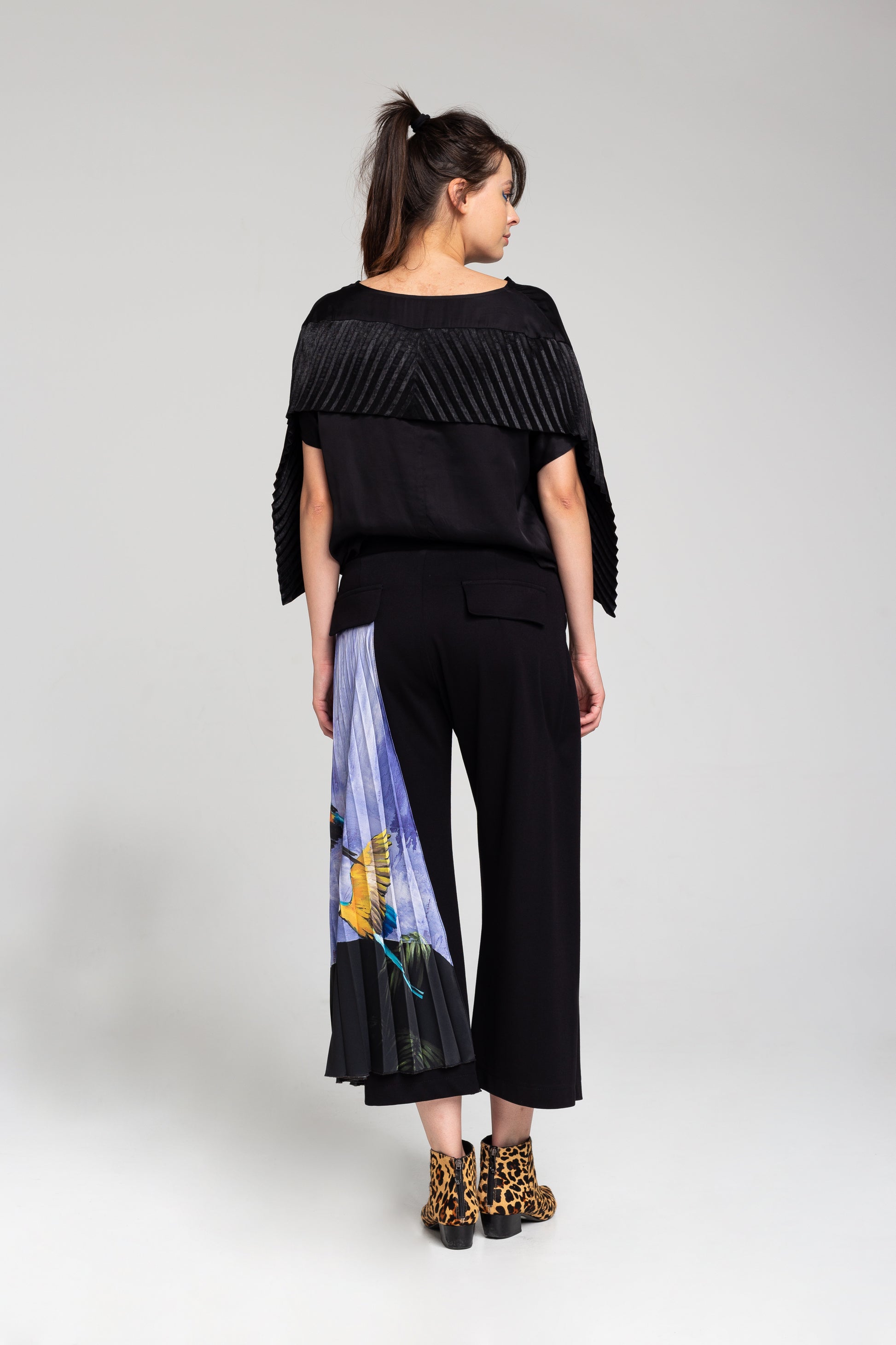 Overlapped pants with pleated printed fabrics on one leg. Prints were designed by the artwork of Ludovic Thiriez.