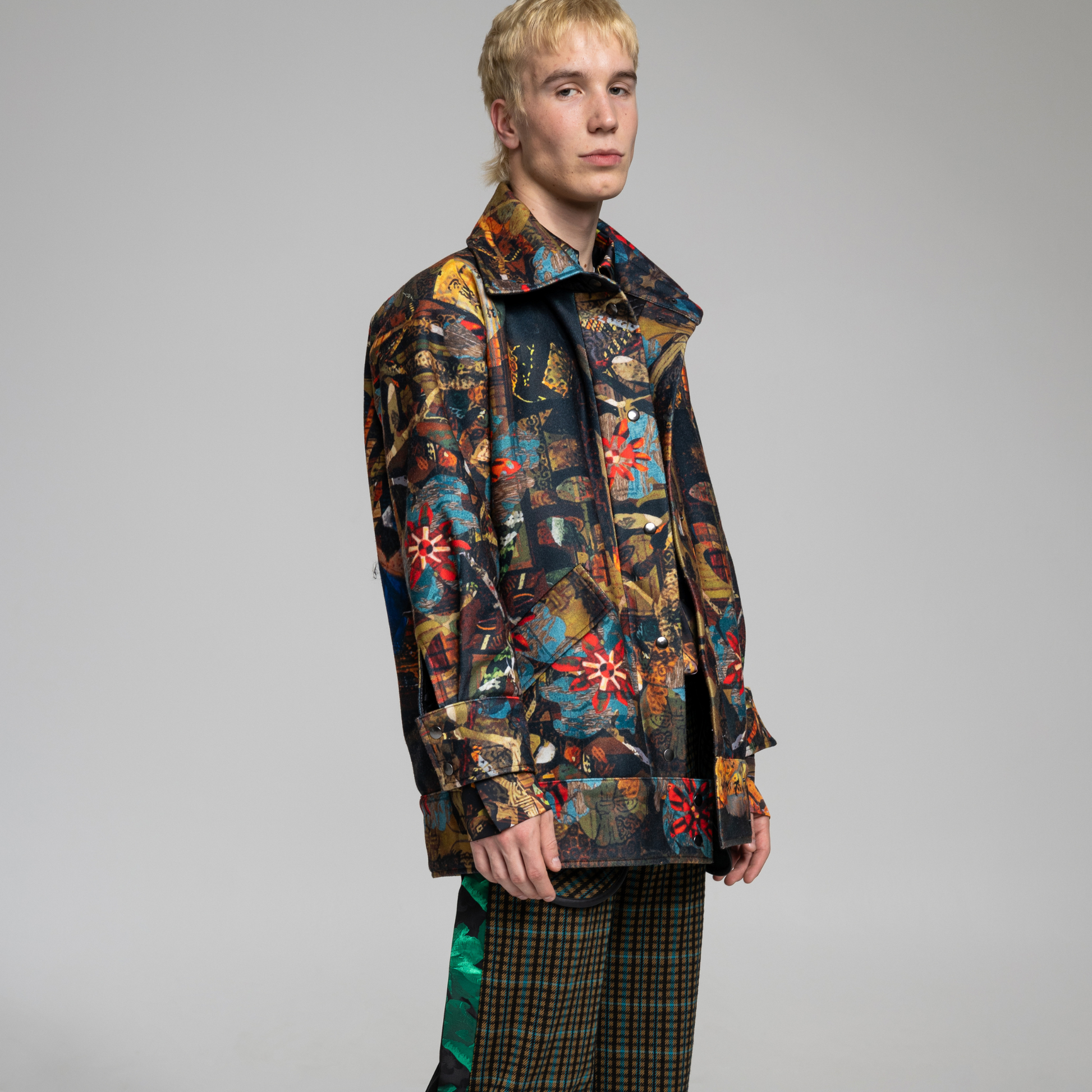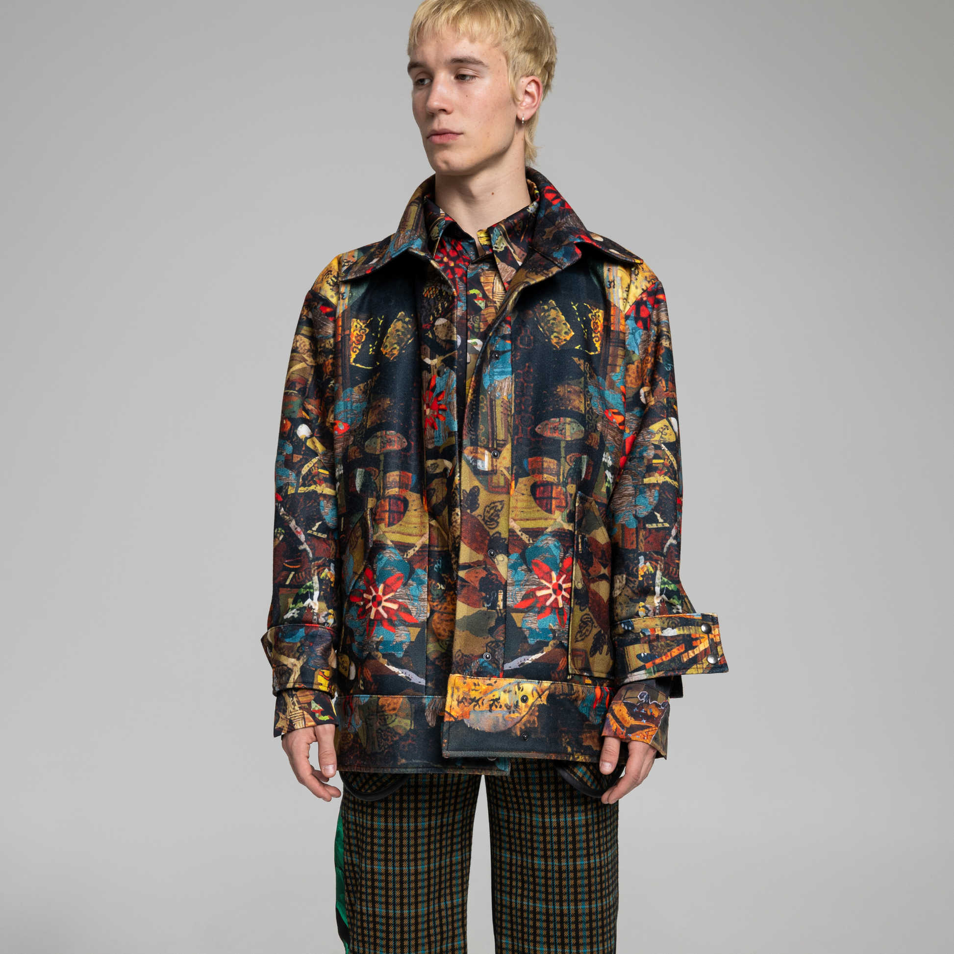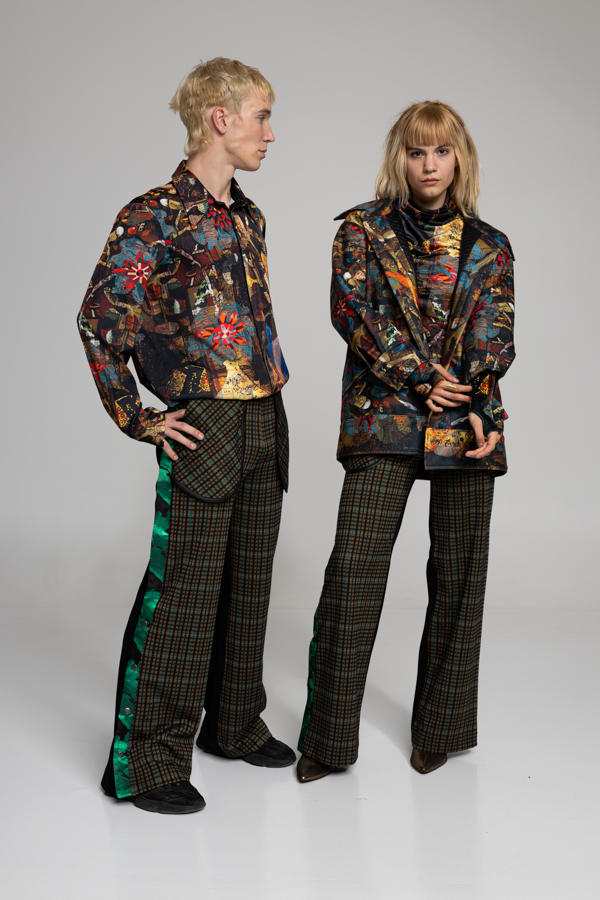 The PLAYER jacket's unique and colourful print were made of the artwork of our painter friend, Bazil Duliskovich. The layers and aesthetics of Bazil's paintings are one of the main inspirations for this autumn-winter collection.