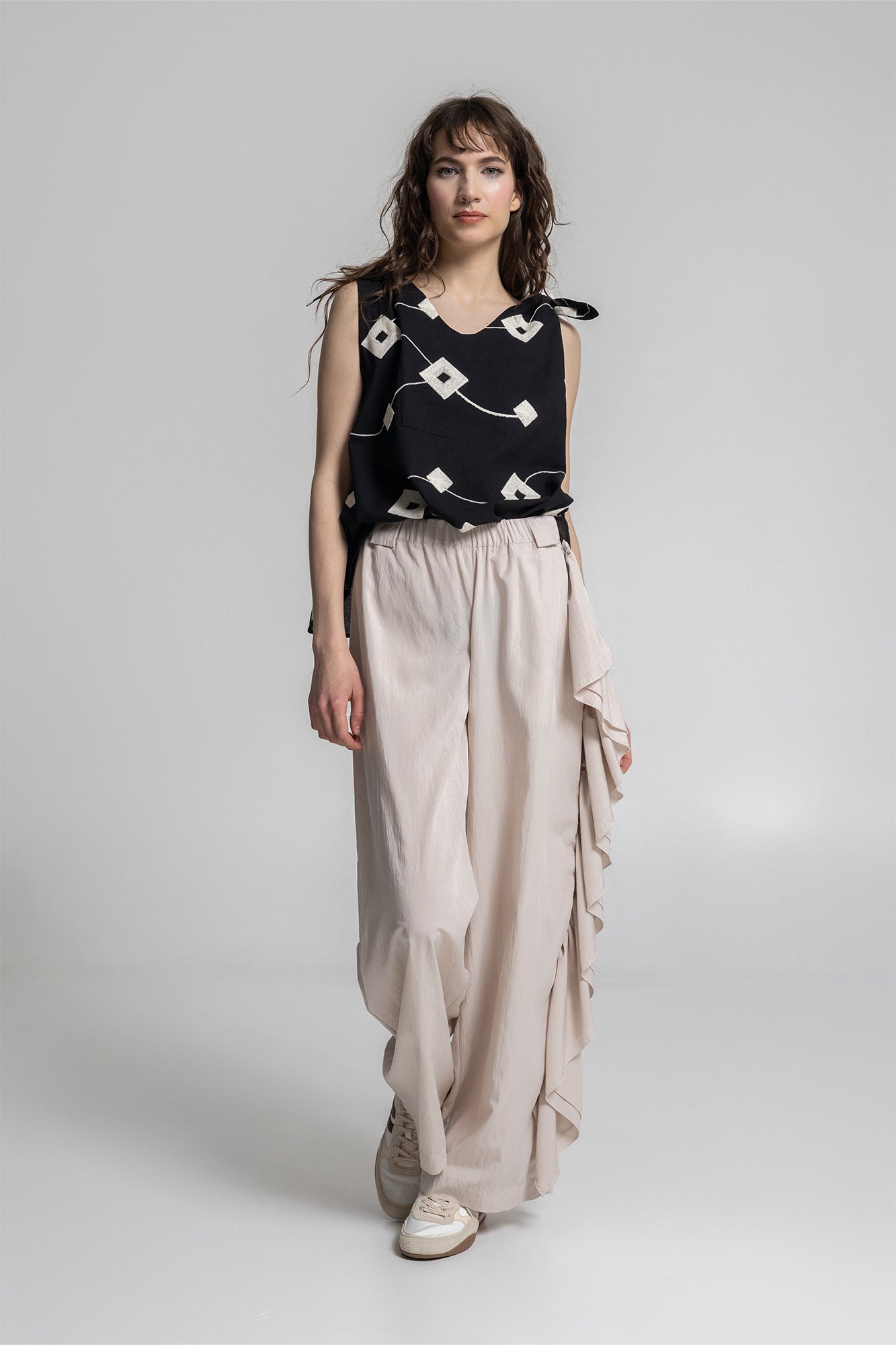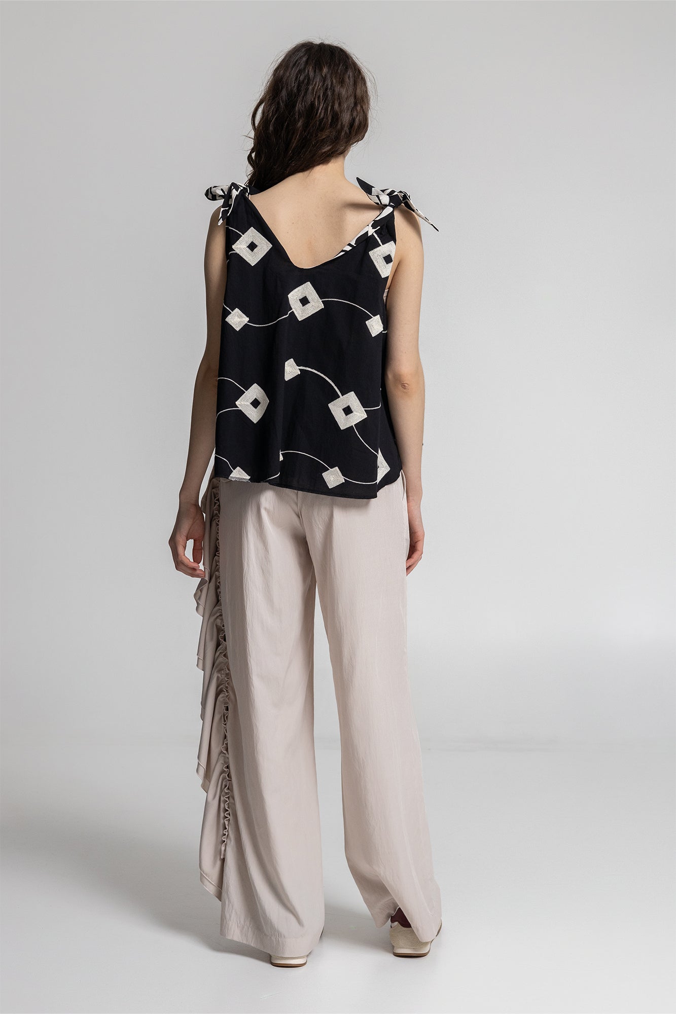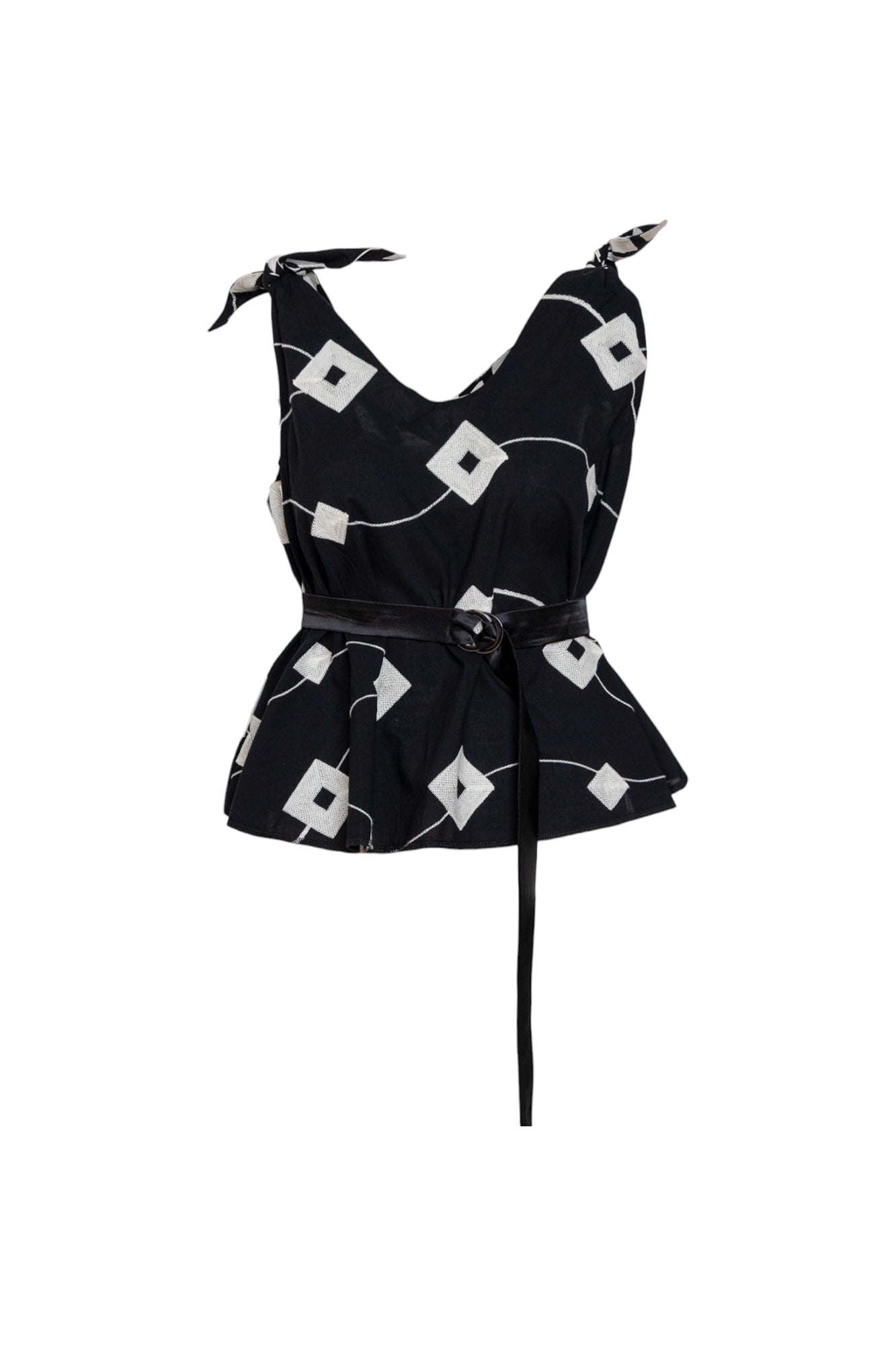 Meet the PULSE Top: a sleeveless essential in black. This sleeveless design features adjustable straps on the shoulders, perfect for a tailored fit. Crafted from premium embroidered cotton fabric, the v-neckline exudes sophistication. Complete the look with its own tie belt for a touch of elegance.