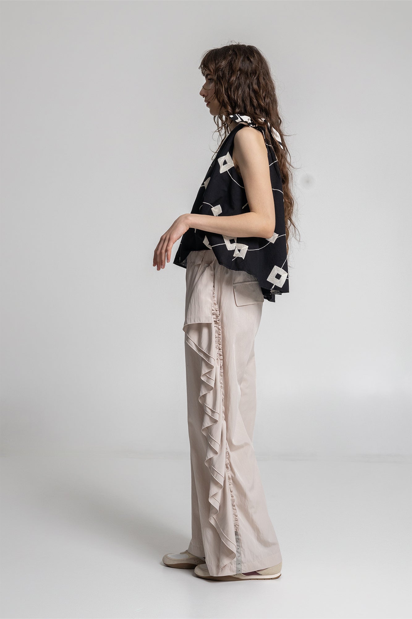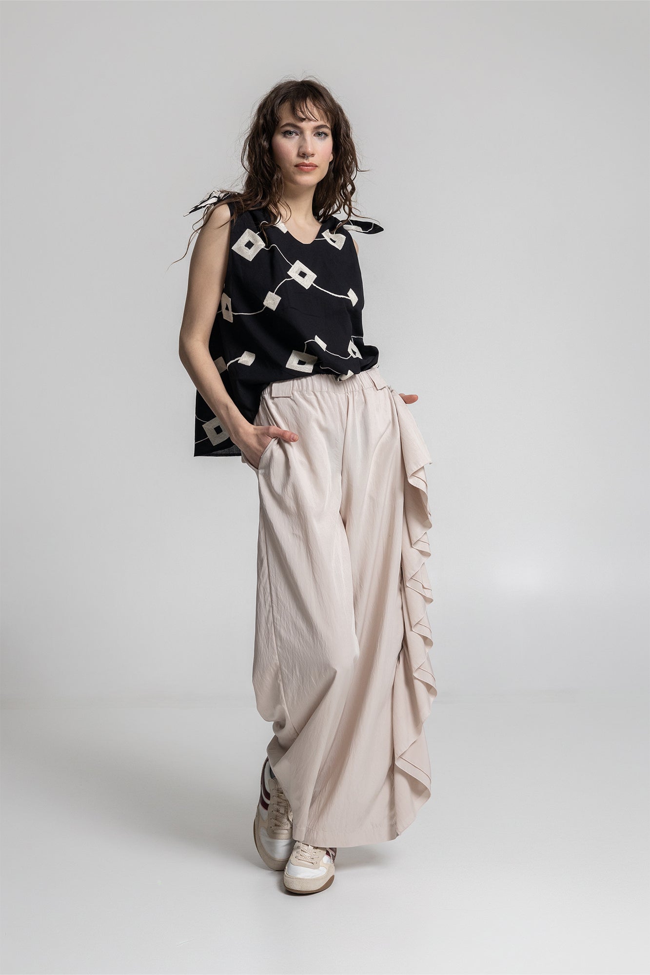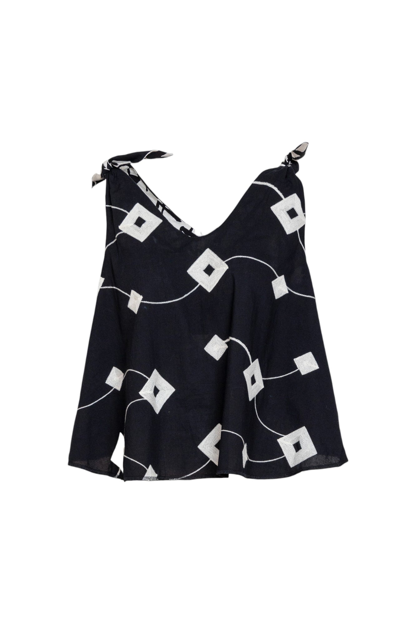 Meet the PULSE Top: a sleeveless essential in black. This sleeveless design features adjustable straps on the shoulders, perfect for a tailored fit. Crafted from premium embroidered cotton fabric, the v-neckline exudes sophistication. Complete the look with its own tie belt for a touch of elegance.