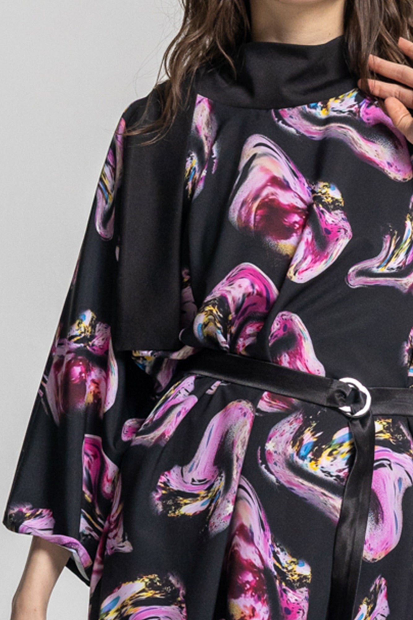 This Rose Silky High Neck Mini Dress features a delicate rose crystal-like print on smooth synthetic silk fabric with a subtle stretch for comfort. Its distinctive asymmetric high neck and 3/4 length kimono-style sleeves offer a graceful silhouette and the above-the-knee length adds a modern touch to this design. The inset black satin tie belt defines the waist, enhancing the dress’s refined and sophisticated appeal. Perfect for occasions where understated luxury meets contemporary design.