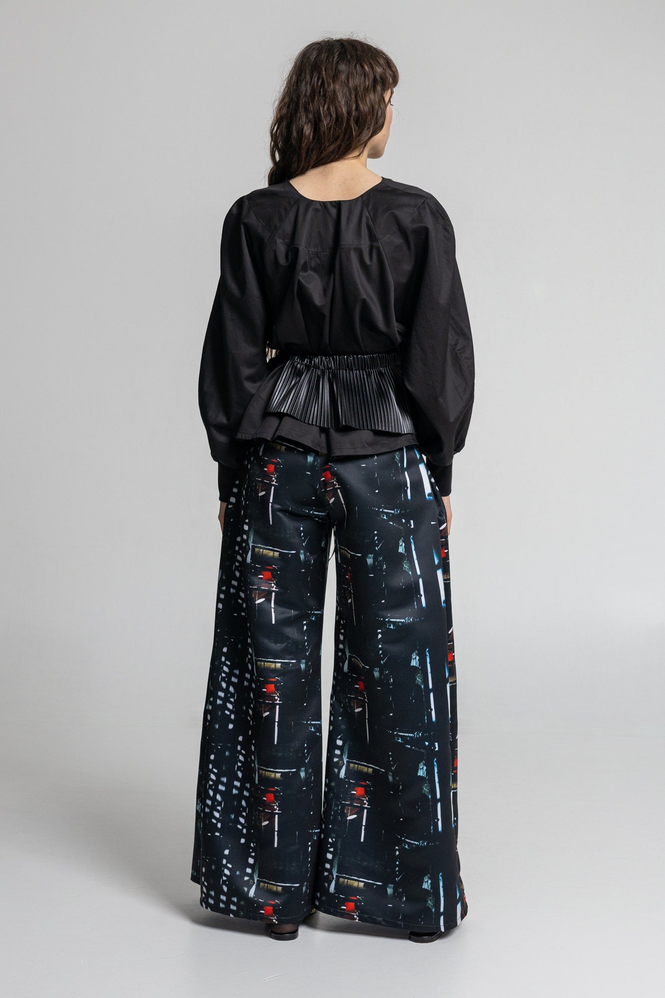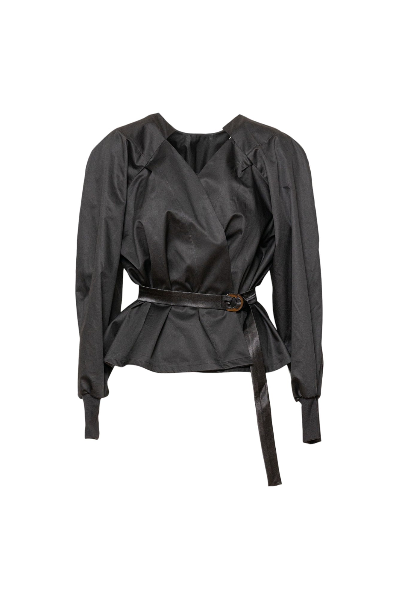 The Sarah V-neckline Blouse features a smooth cotton blend fabric that offers elegance and everyday ease. Its mid-length overlapped design creates a polished look complemented by exaggerated puffy sleeves ending in elastic ribbed long cuffs that form a graceful bell shape. Please note, the belt is not included. This blouse is perfect for those seeking refined style with distinctive details.