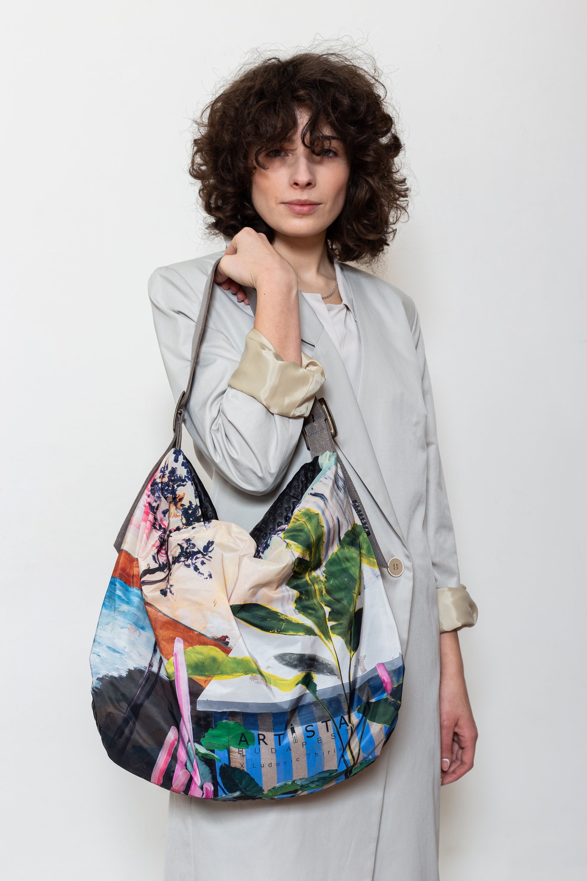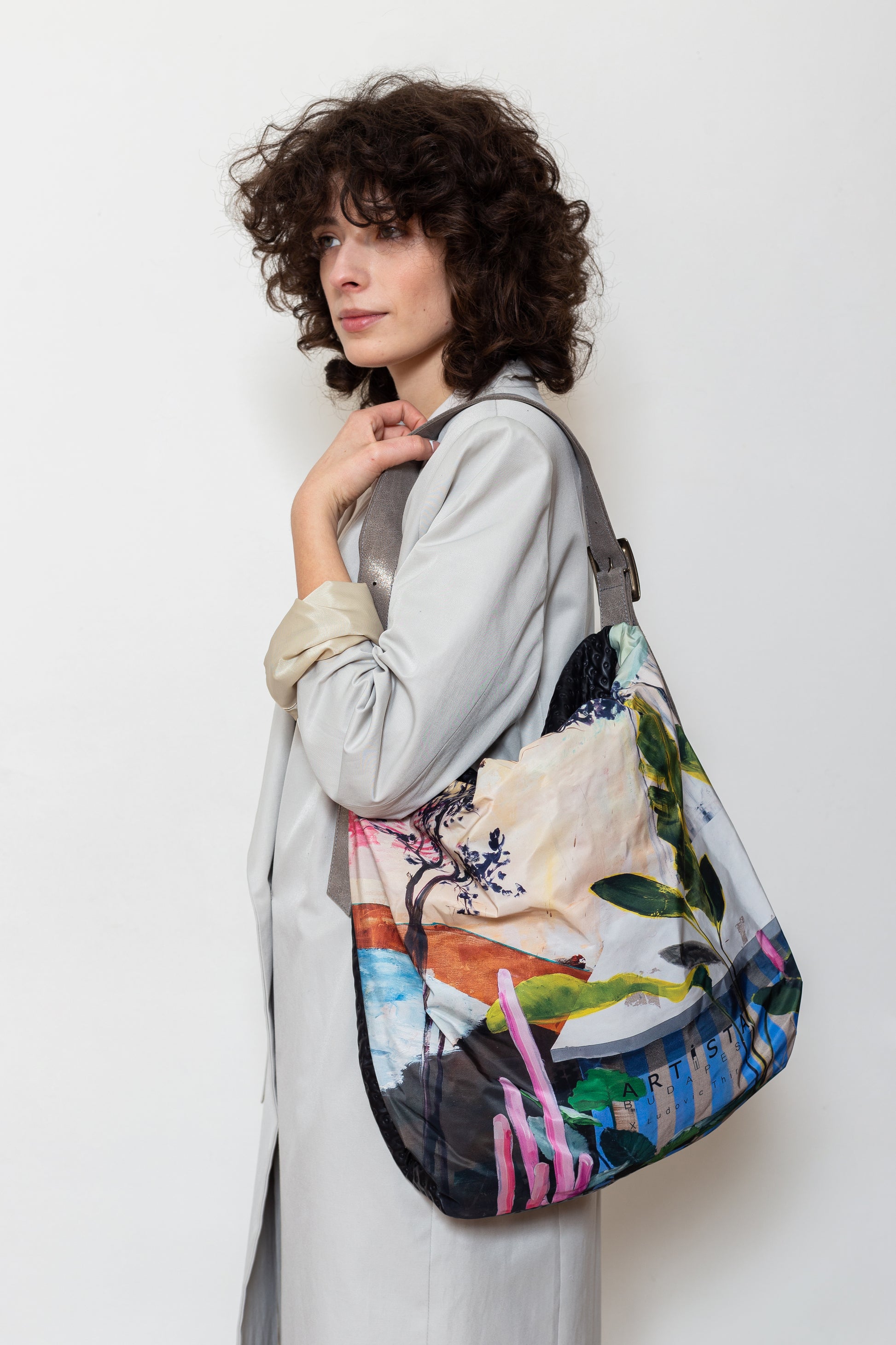 Printed textile bag with pocket inside. The adjustable strap is made of leather .
