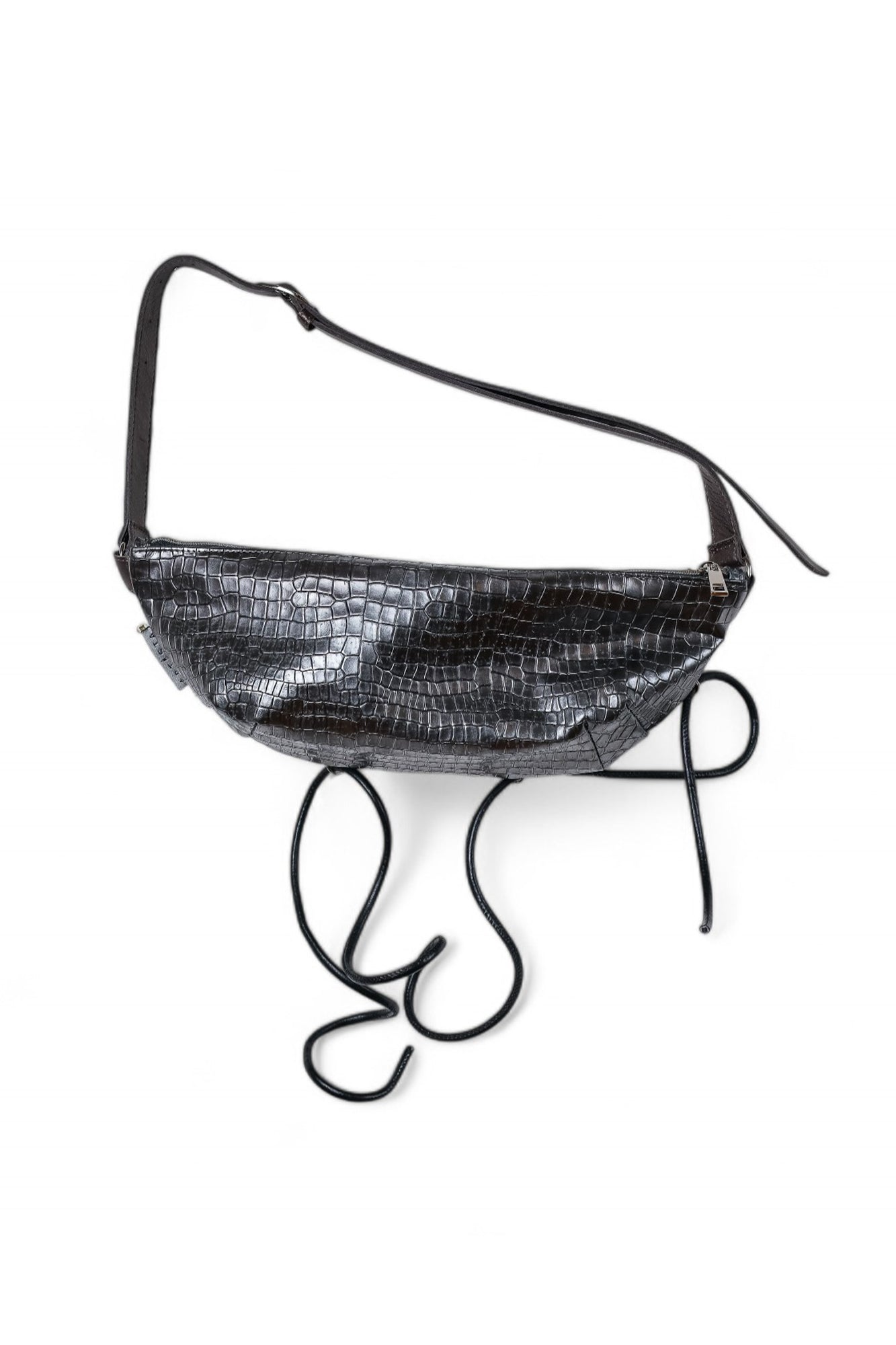 New for this season is an embossed leather ikebana bag. The SILVERED HYPE ikebana bag is crafted from croc embossed black leather and features include a zip compartment and inset separate pocket allowing for organized storage. This practical and polished piece also has an adjustable leather shoulder strap for styling versatility to be worn as either a bum bag or a crossbody bag. Elevate your style with this must-have accessory!