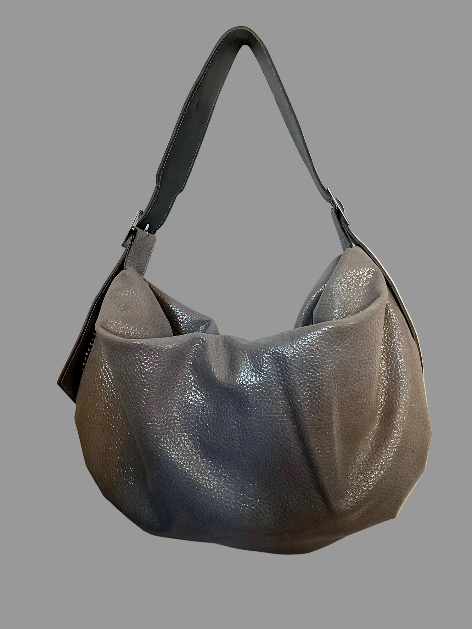Shoulder or crossover bubble bag, made of shiny bronze leather, with adjustable leather straps on the shoulder.