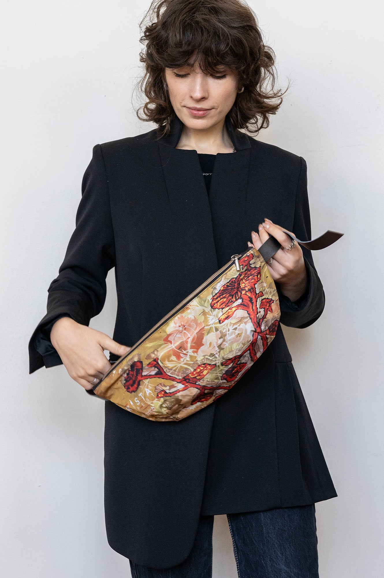 Introducing the chich accessory to elevate your look: the SOLAR bum bag. Featuring a striking artful print on the front and a plain back version on the back. The adjustable leather strap ensures a comfortable fit and a touch of luxury. Combining elegance and functionality, this bag is the perfect way to add sophisticated edge to your style everyday or a special occasion.