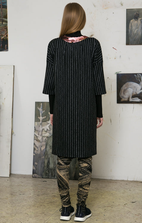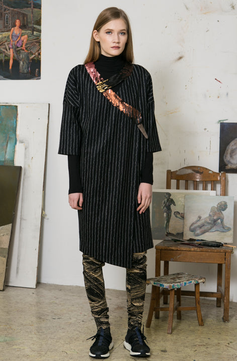 Easy and unique, overlapped dress, made of soft, striped jersey, with sequined swan on the neckline. Wear it with pants or leggings.