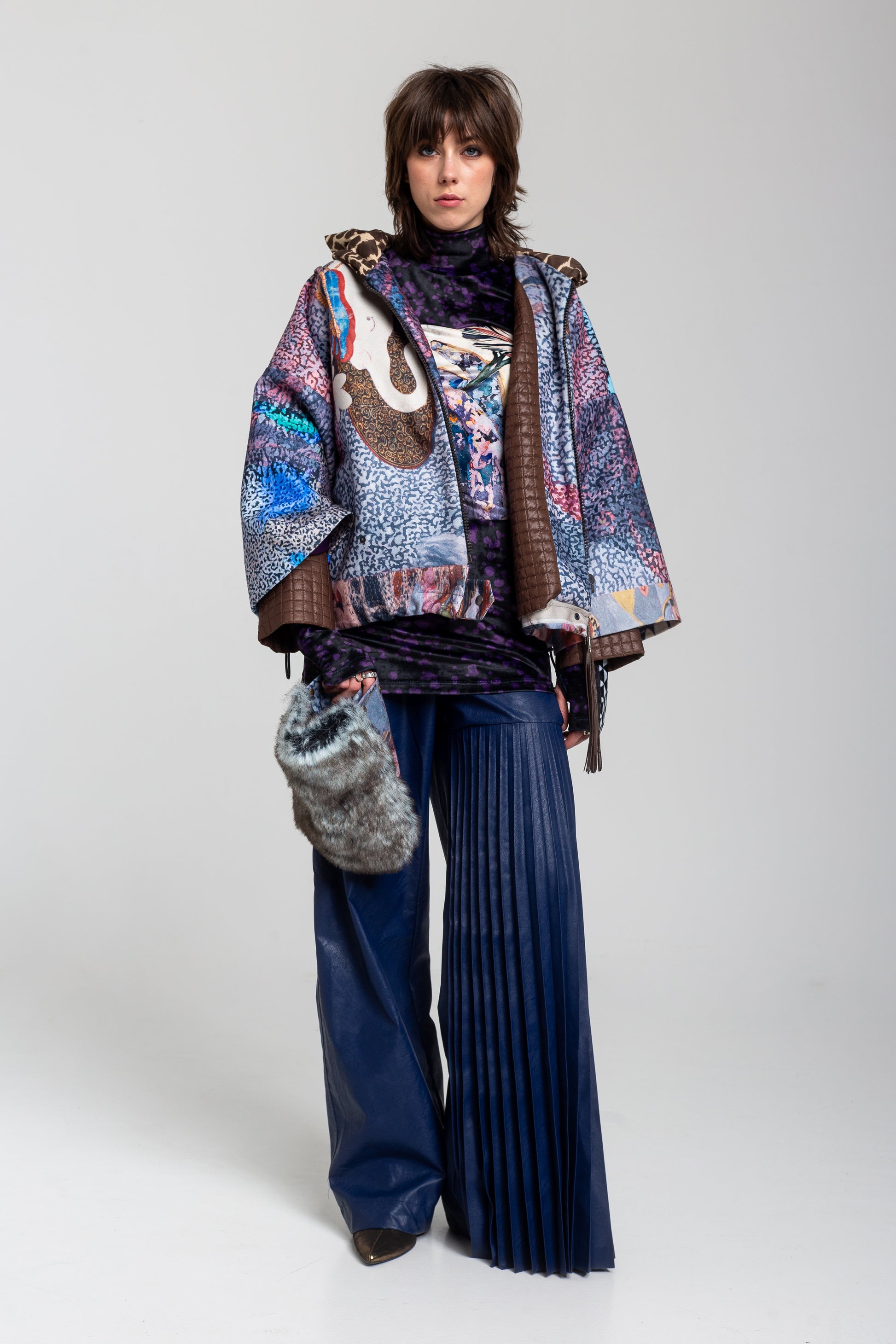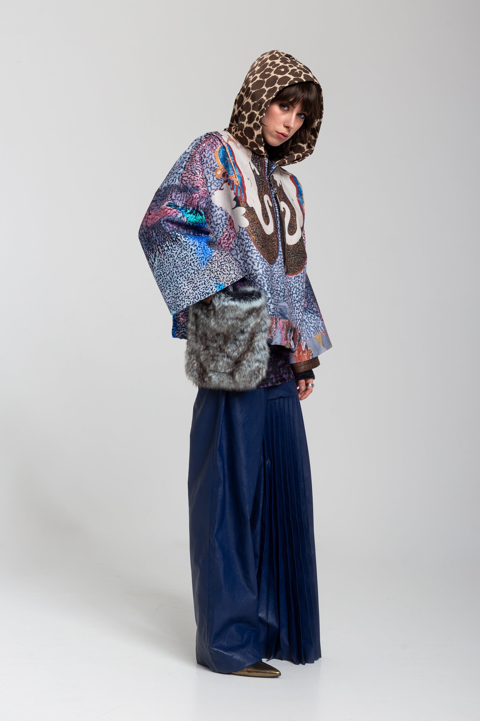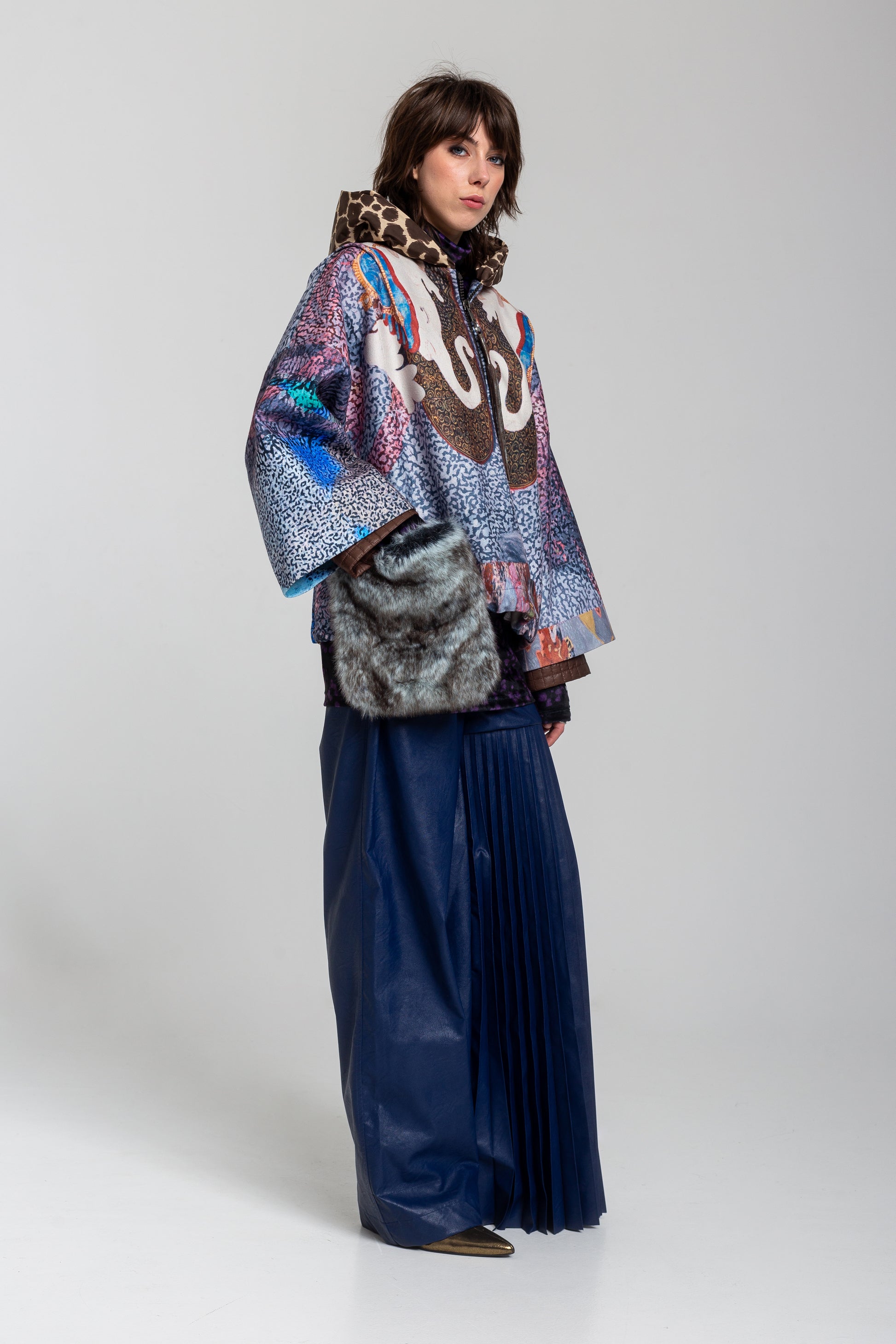 The TARA jacket is a luxuriously crafted printed jacket designed to keep you cozy and stylish. This short kimono-like garment features a printed coat-fabric outer layer, a detachable fur pocket, and a quilted inner lining for extra comfort and warmth. Upgrade your wardrobe with the perfect combination of style and practicality.