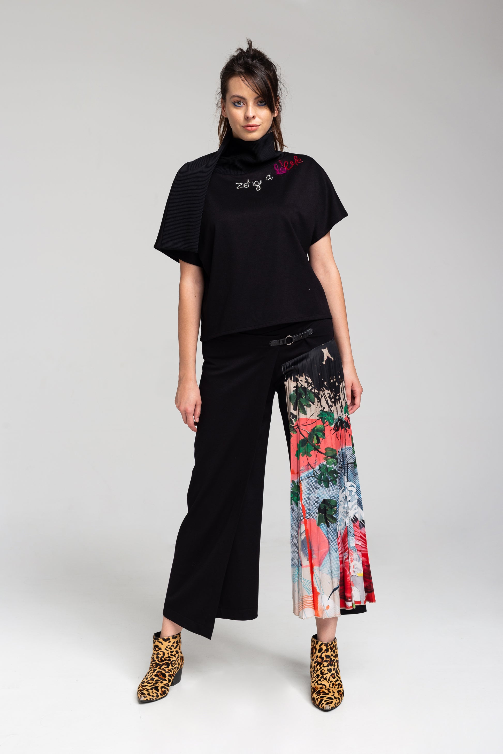 Overlapped pants with pleated printed fabrics on one leg. Prints were designed by the artwork of Ludovic Thiriez