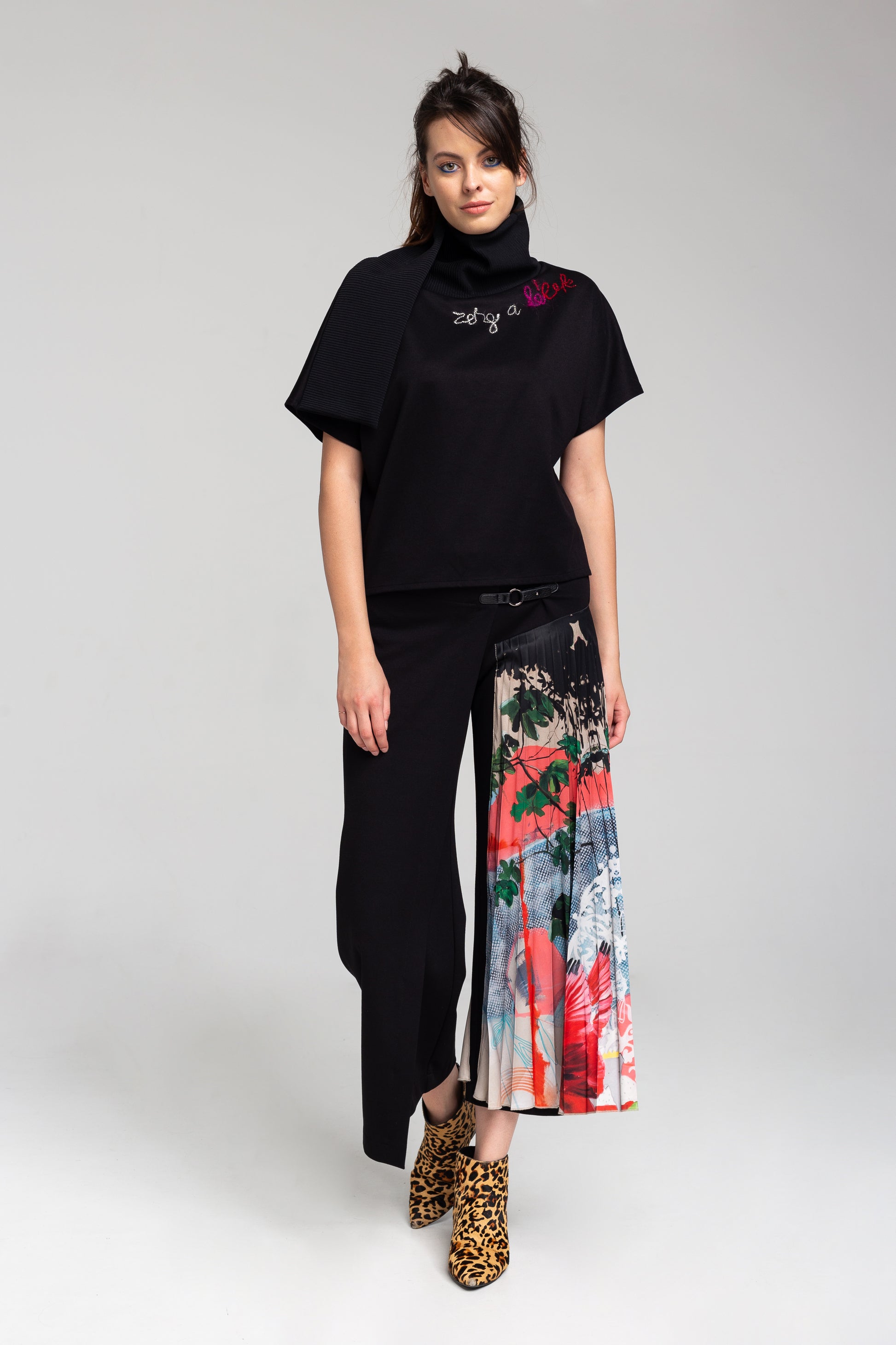 Made of elastic viscose and polyester mix jersey, with printed polyester pleated fabric.