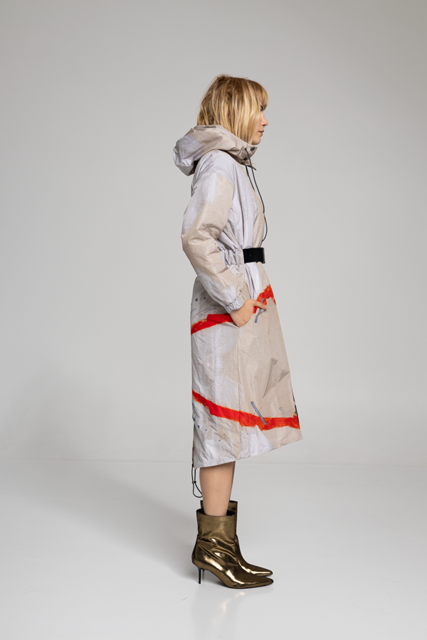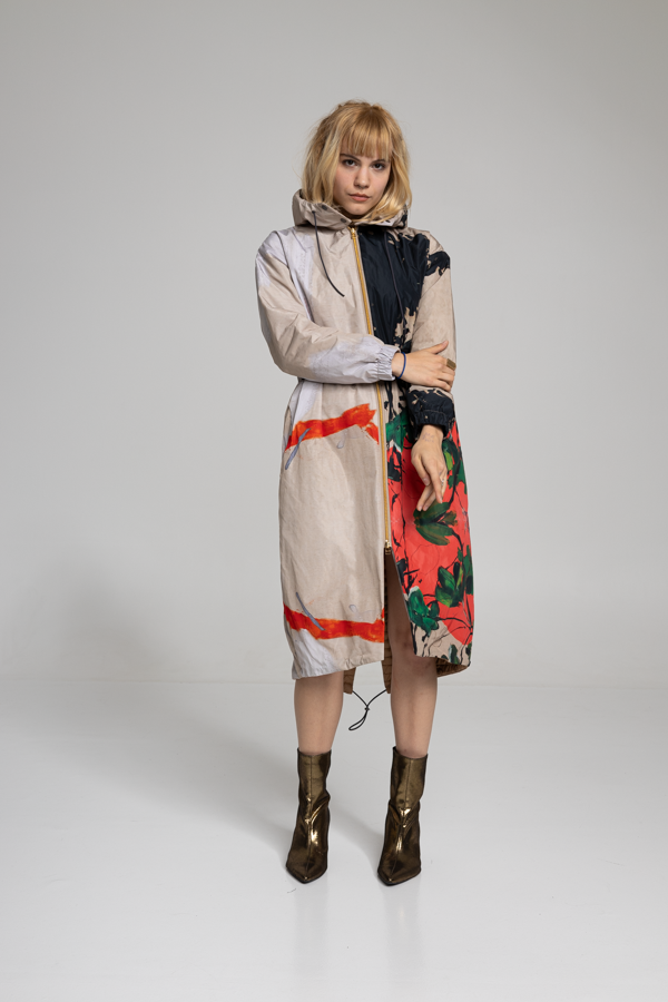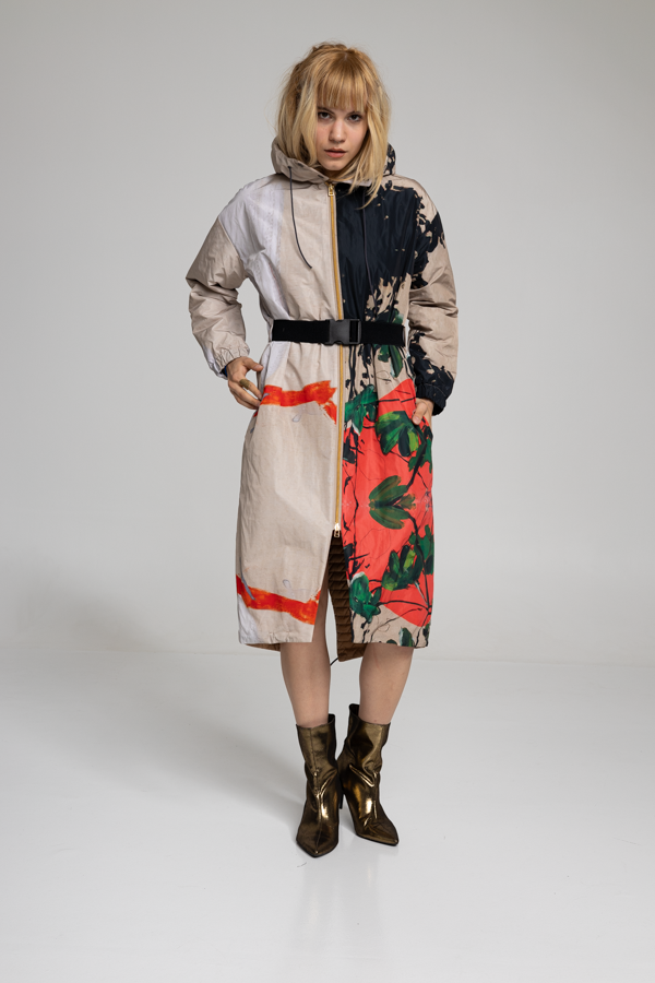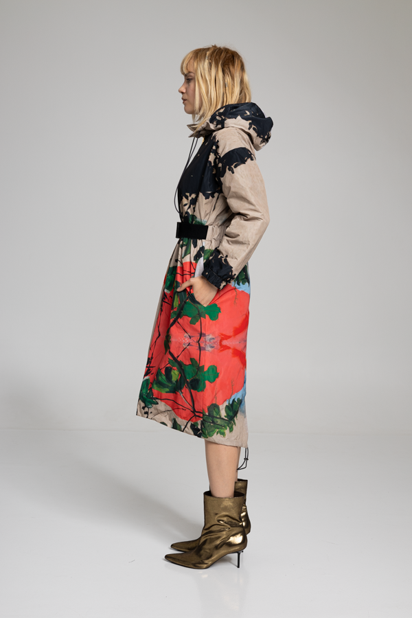 The YOKO HOODED jacket brings classic parka style with a modern twist, boasting one of Ludovic Thiriez's exquisite paintings. The jacket features a zip-up closure and a belted waist for complete coverage and has two large pockets on the front to carry your essentials. Crafted from waterresistant material.