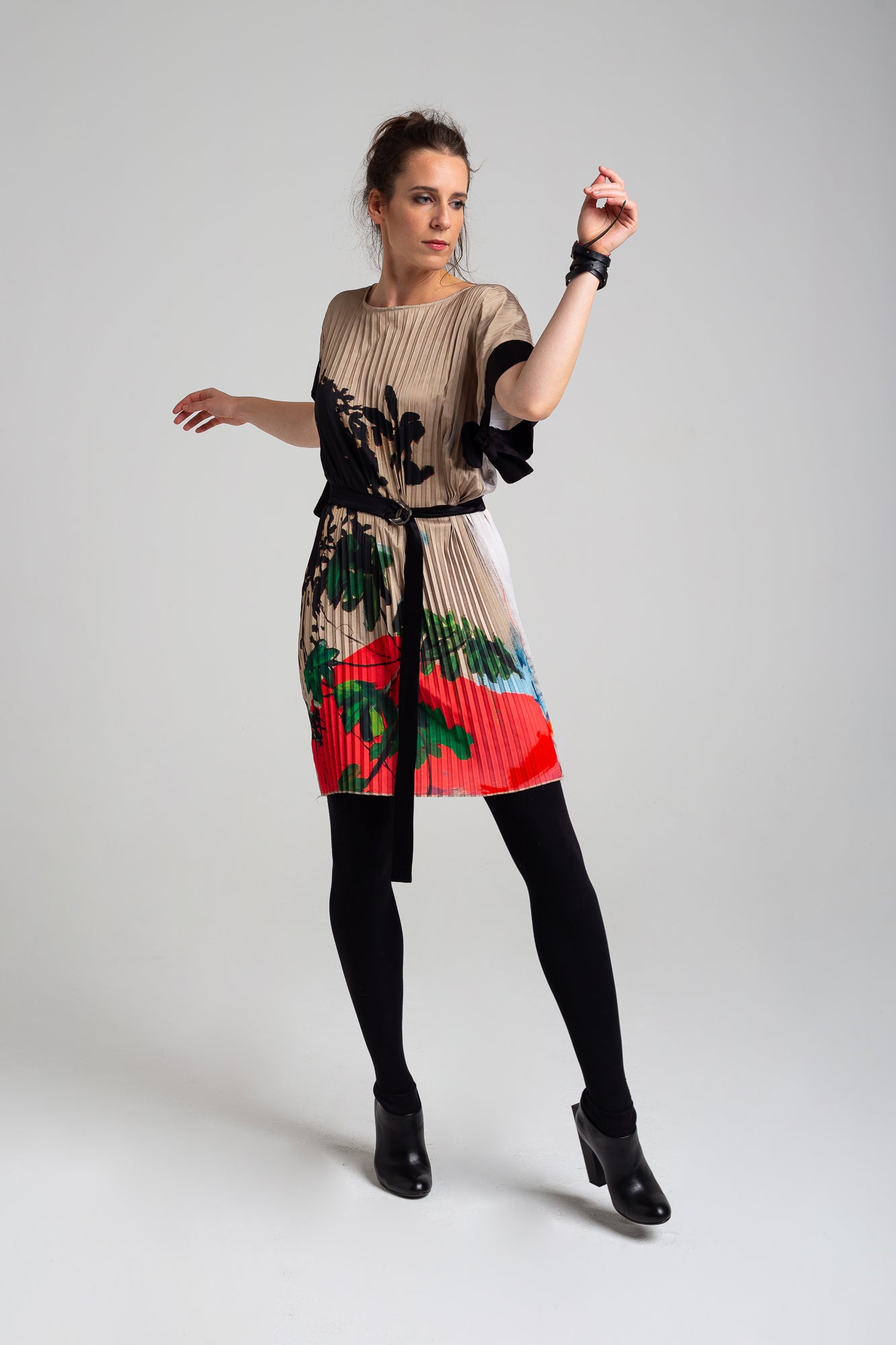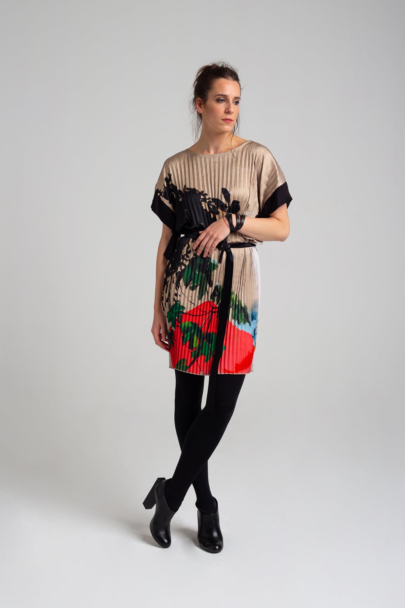 Short pleated dress, made with the unique prints of the French painter, Ludovic Thiriez' painting.